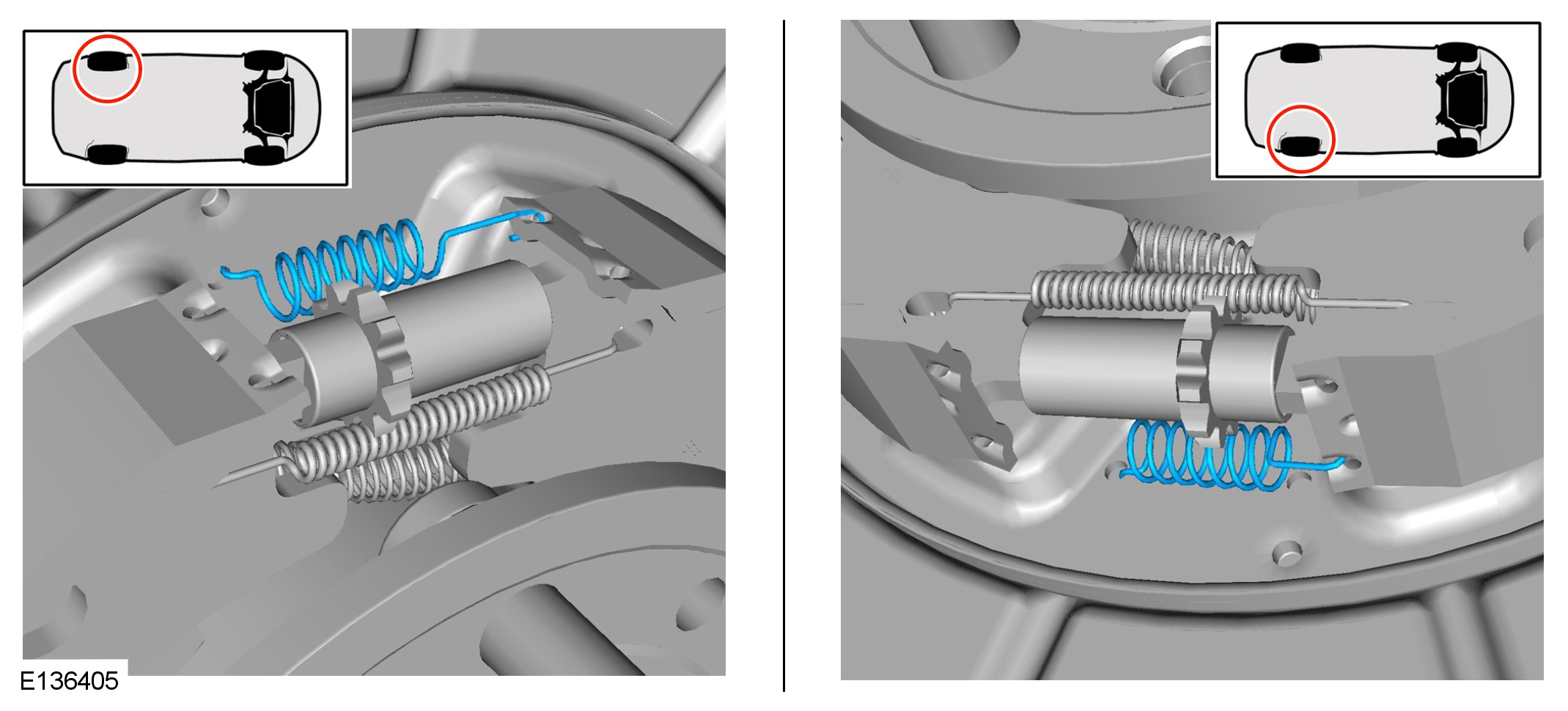 CAUTION: Make sure that the green bias spring is installed to the right hand parking brake shoes and the red bias spring is installed to the left hand parking brake shoes.