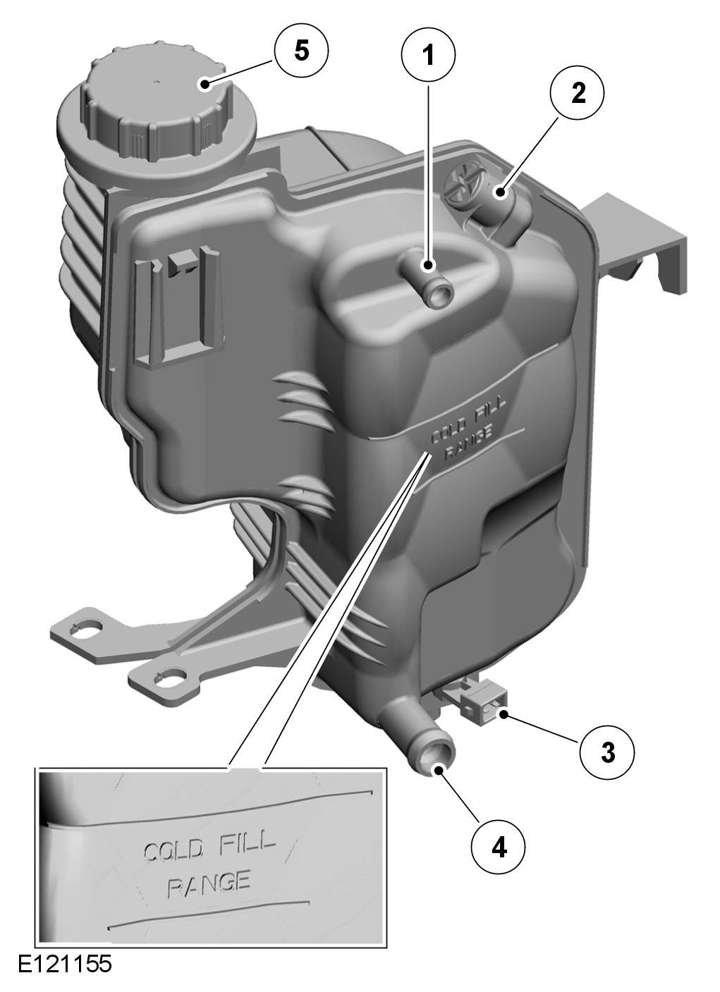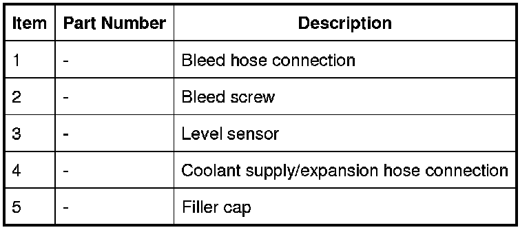 The expansion tank is installed on the LH (left-hand) side of the cooling module, attached to the radiator support assembly and the floor sidemember. A filler cap, bleed screw and level sensor are incorporated into the expansion tank. MAX and MIN level markings are molded onto the exterior of the tank.