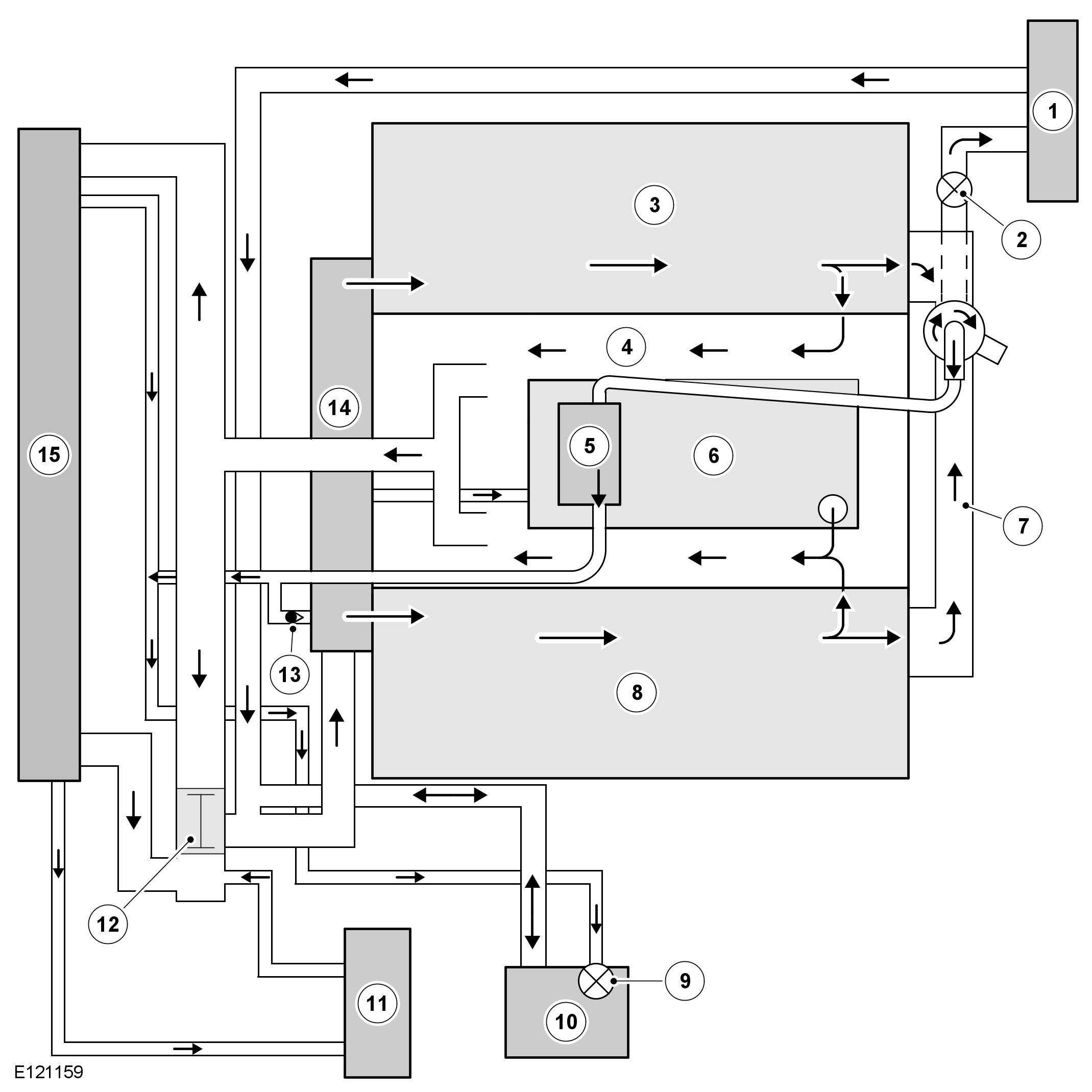 From the heater manifold the coolant flows through the electronic throttle and the heater core, in parallel circuits that are unaffected by the position of the thermostat. From the electronic throttle, the coolant merges with bleed coolant from the coolant pump and flows to the expansion tank. From the heater system, the coolant flows back to the inlet of the coolant pump.