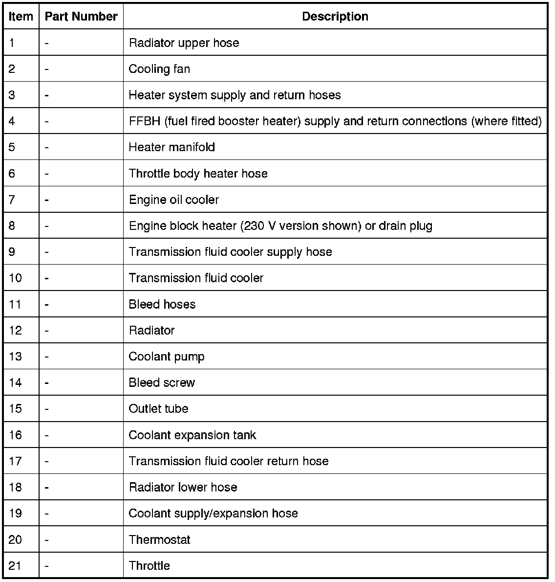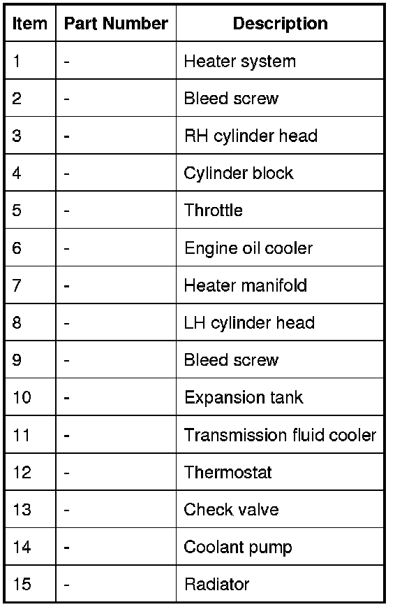 In the cylinder block, the coolant flows forwards to the outlet tube. When the coolant is cold, the thermostat is closed and the coolant flows direct from the outlet tube back to the coolant pump. Once the coolant reaches operating temperature the thermostat begins to open, to control system temperature, and coolant flows from the outlet tube to the coolant pump via the radiator. When the thermostat is open, the coolant flow through the radiator also generates a coolant flow through the transmission fluid cooler.