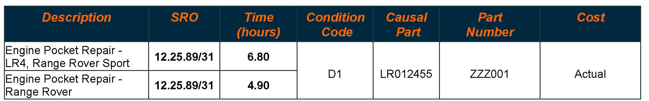 Repair procedures are under constant review, and therefore times and prices are subject to change; those quoted here must be taken as guidance only. Always refer to DDW to obtain the latest repair time. Claim only the actual cost of the locally-sourced part using code 'ZZZ001'.