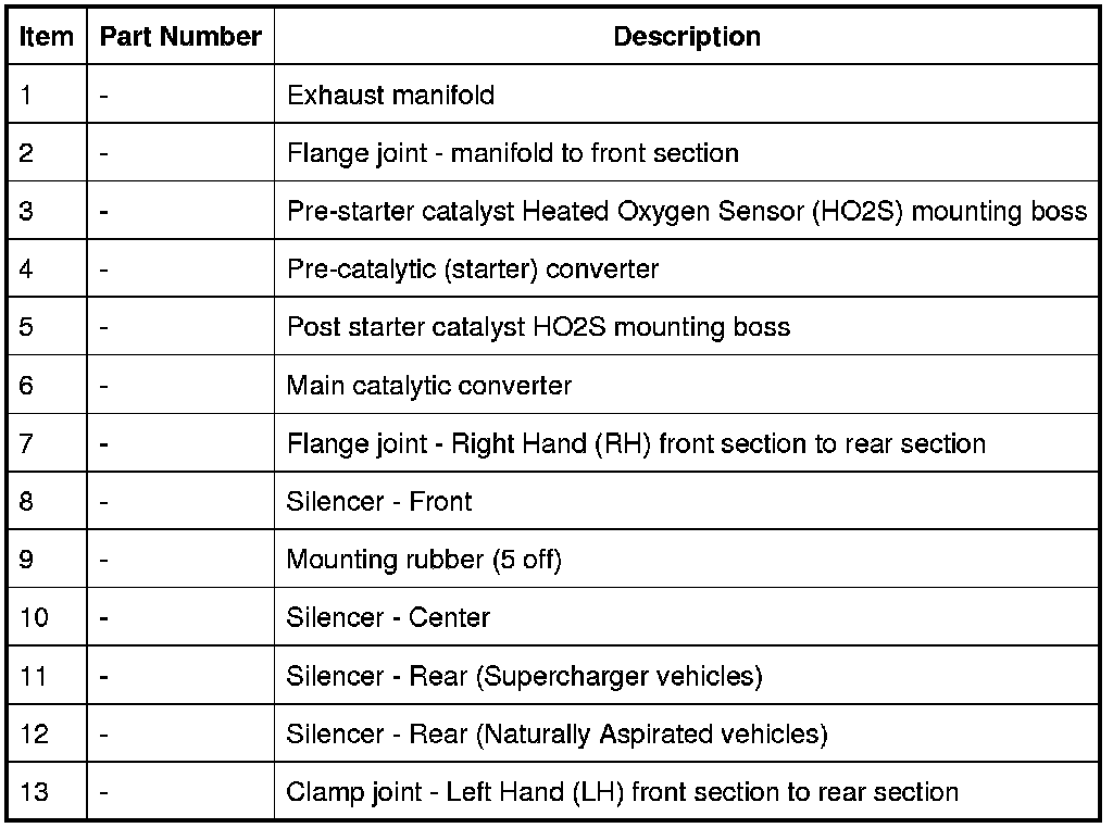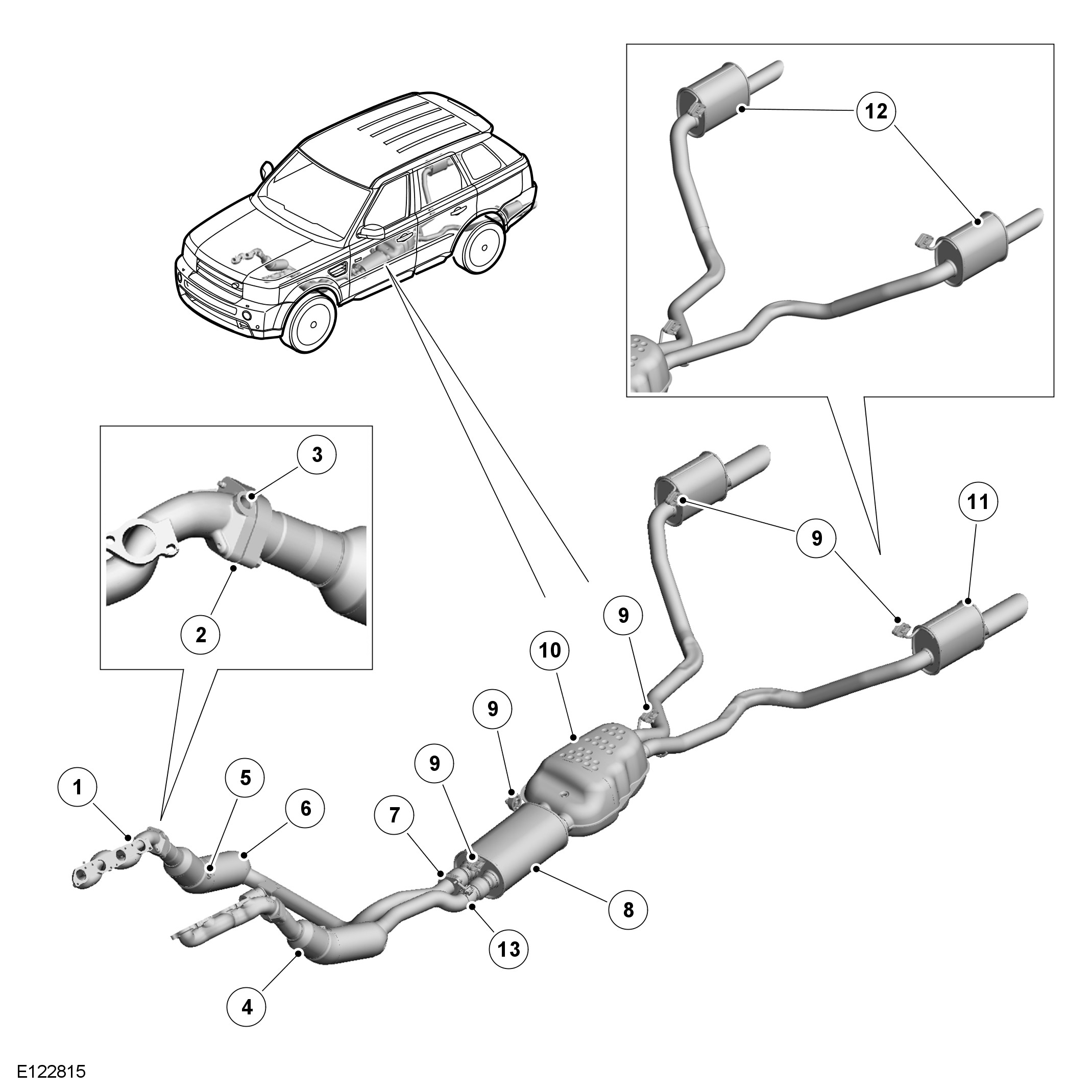 The 5.0L V8 exhaust system is fabricated from stainless steel and is supplied as three separate assemblies; a Left Hand (LH) front section incorporating a catalytic converter, a Right Hand (RH) front section incorporating a catalytic converter and a rear section incorporating a front silencer, a centre silencer and two rear silencers.