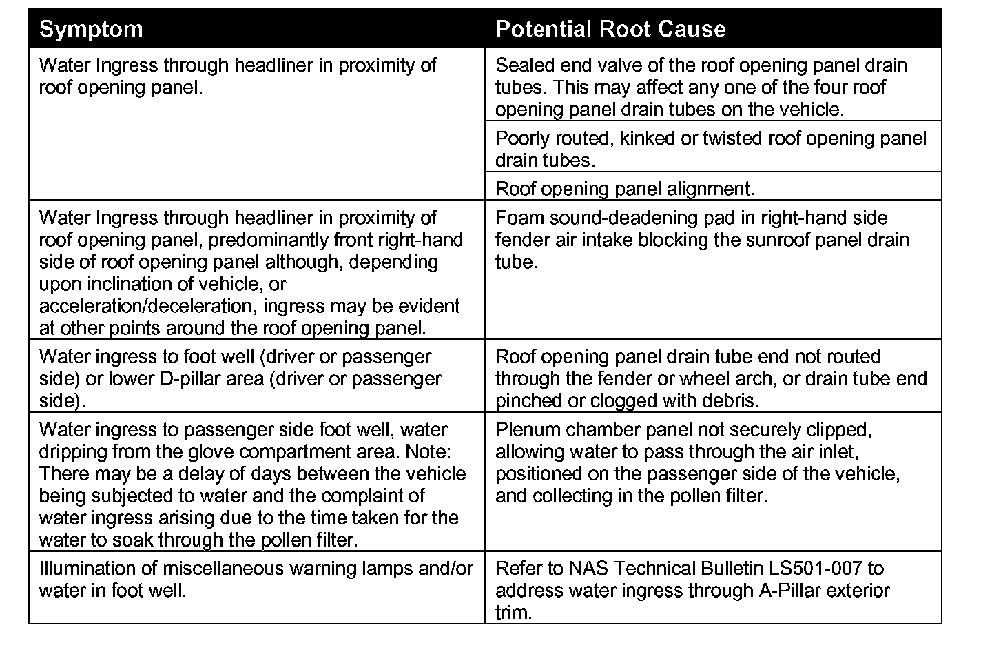 This bulletin provides technicians with guidance for identification of possible water ingress causes when water enters the passenger compartment. If a customer complains of water ingress, locate the point of origin and take the appropriate corrective action.