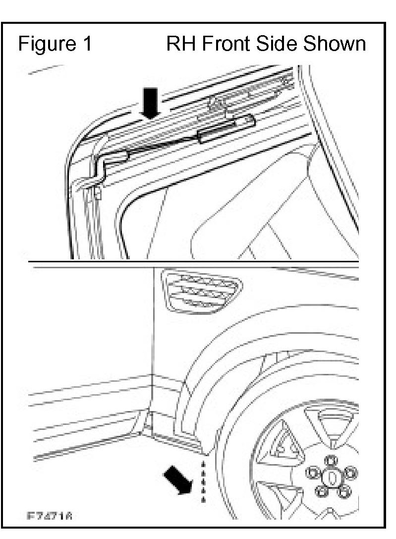 ^ Confirm that water has pooled on the ground at all four drain points under the A-pillar and D-pillar on both sides of the vehicle. (Figures 1 and 2)