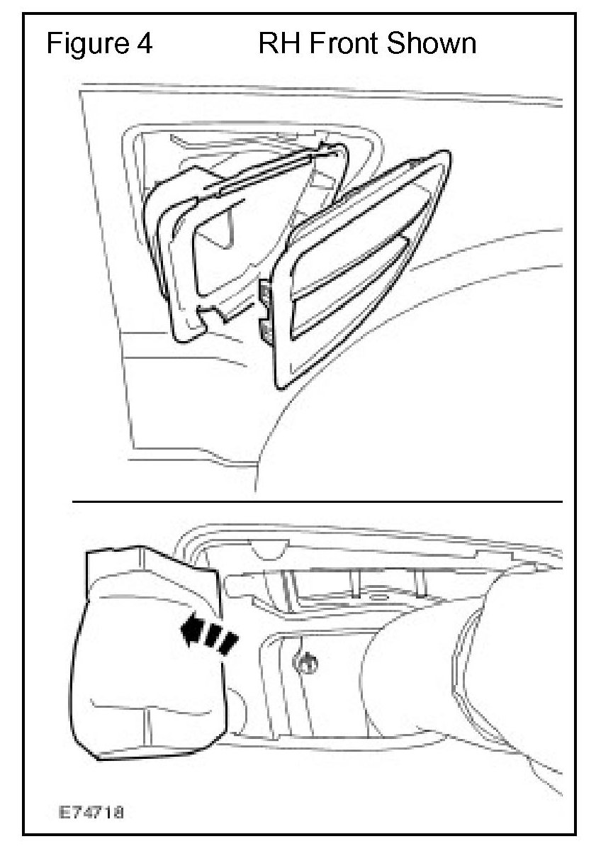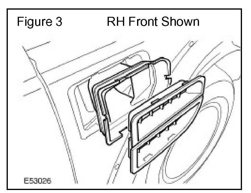 1. Remove the fender air intake grill by first pulling up to release the two lower clips, then pulling outward to release the two upper clips to gain access to the roof opening panel drain tube end. (Figure 3)