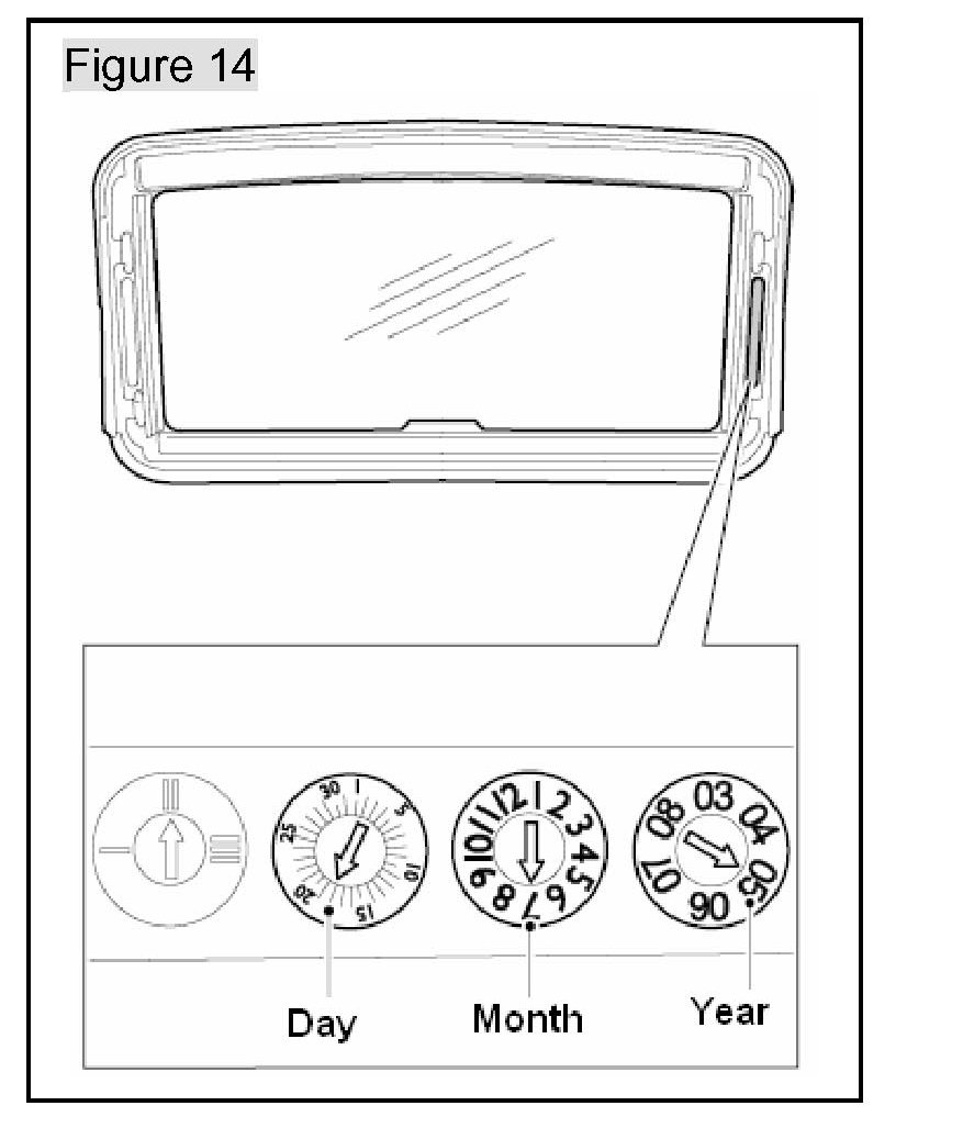 The glass panel assembly production date is determined from the "Day", "Month" and "Year" indicated by the arrows in each of the three dials as illustrated in Figure 14. As an example, the arrows depicted in Figure 14 indicate 18_7~05, a production date of 18- July-2005.*