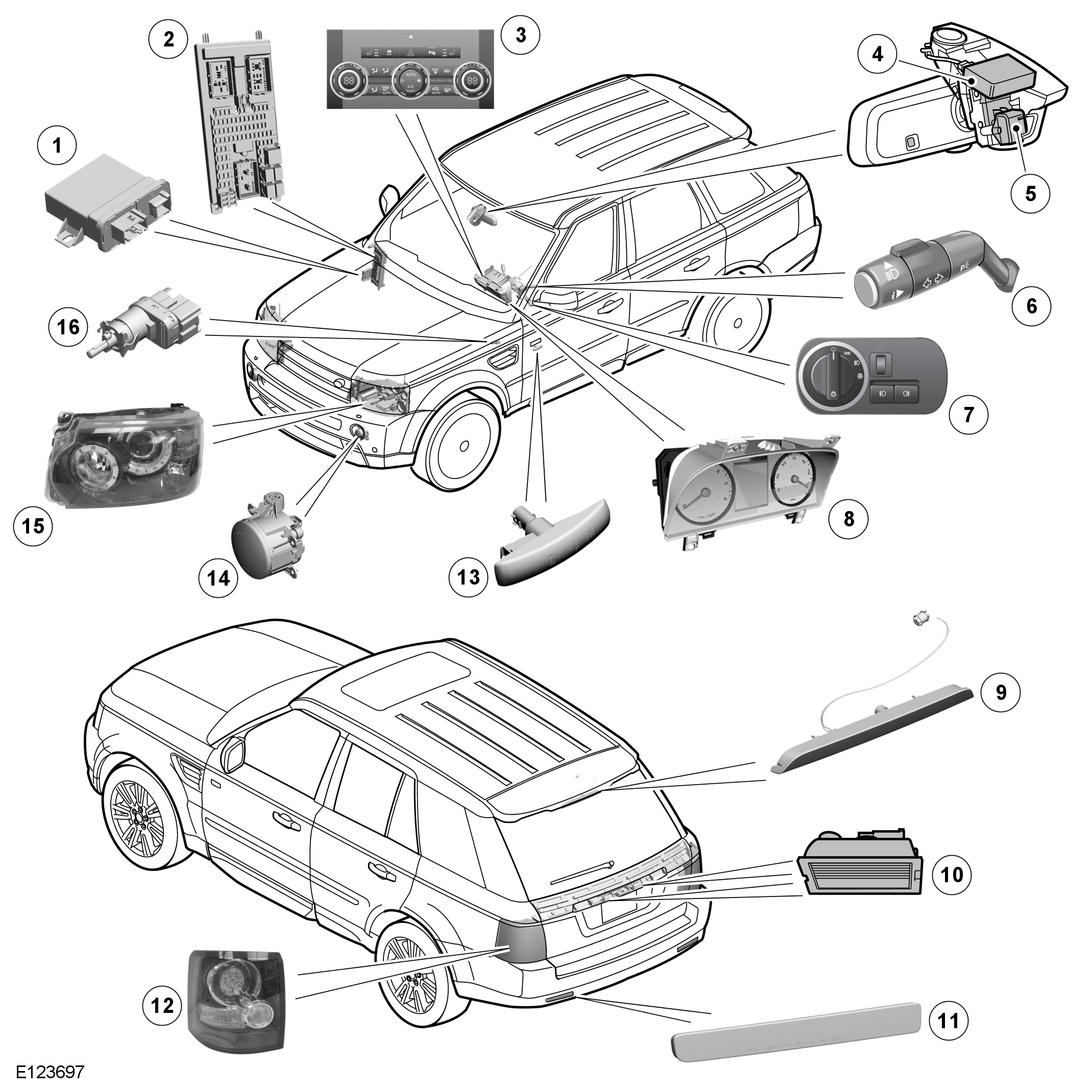 The bulbs and the Light Emitting Diode (LED)'s are driven by Metal Oxide Semiconductor Field Effect Transistors (MOSFET's) within the Central Electronics Module (CEM) which is an integral component of the Central Junction Box (CJB). An exception to this is the front and rear position lamps, front fog lamps and the reversing lamps which are supplied with power via relays within the CJB and are protected by conventional fuses.