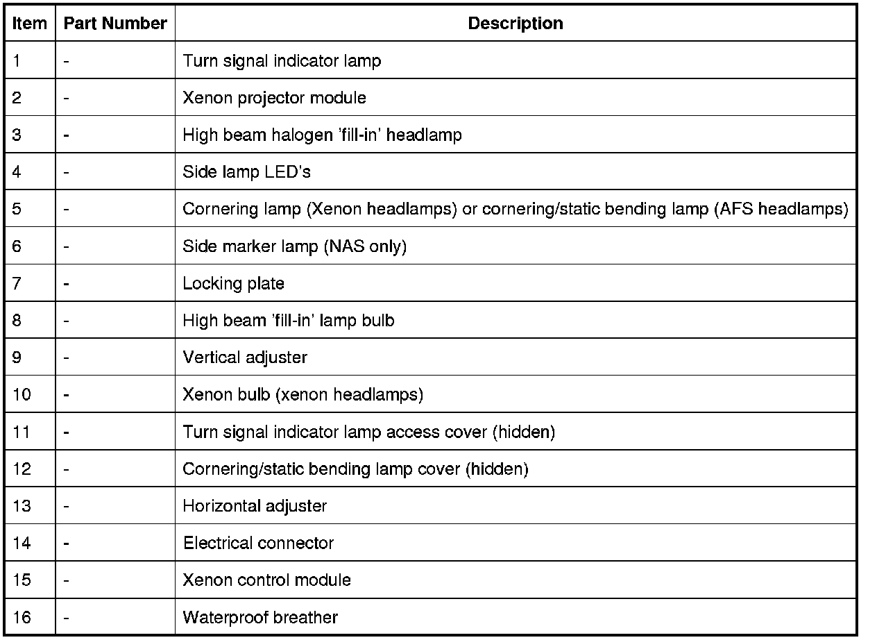 Each headlamp has an integral sixteen pin connector which provides inputs and outputs for the various functions of the headlamp assembly. The usage of the pins differs between model variants, refer to the Electrical Reference Library (ERL) for pin details.