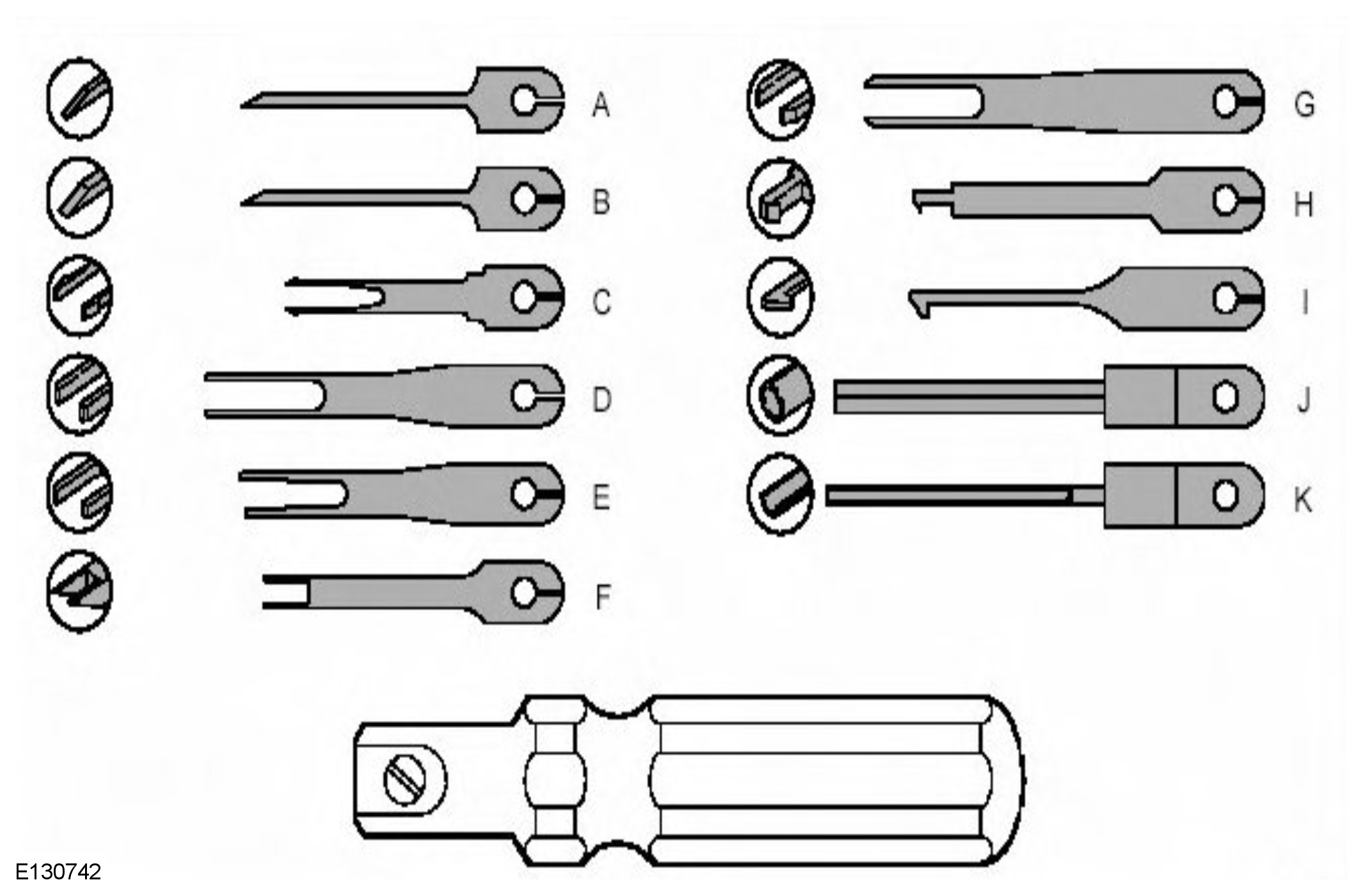 The extraction handle, in conjunction with the correct tip, is used to remove a terminal from an electrical connector. Each tip contained in the wiring harness repair kit is marked with an identification letter, A to K inclusive. Each tip has been specially designed to extract a particular type of electrical connector terminal. The use of any other tool is not recommended and is liable to cause damage to the electrical connector. The tip is fastened to the handle by a screw which holds the tip firmly yet allows it to be easily replaced.