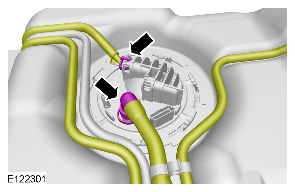 CAUTION: Position the breather hose and vent hose through the vehicle body during the fuel tank removal operation.