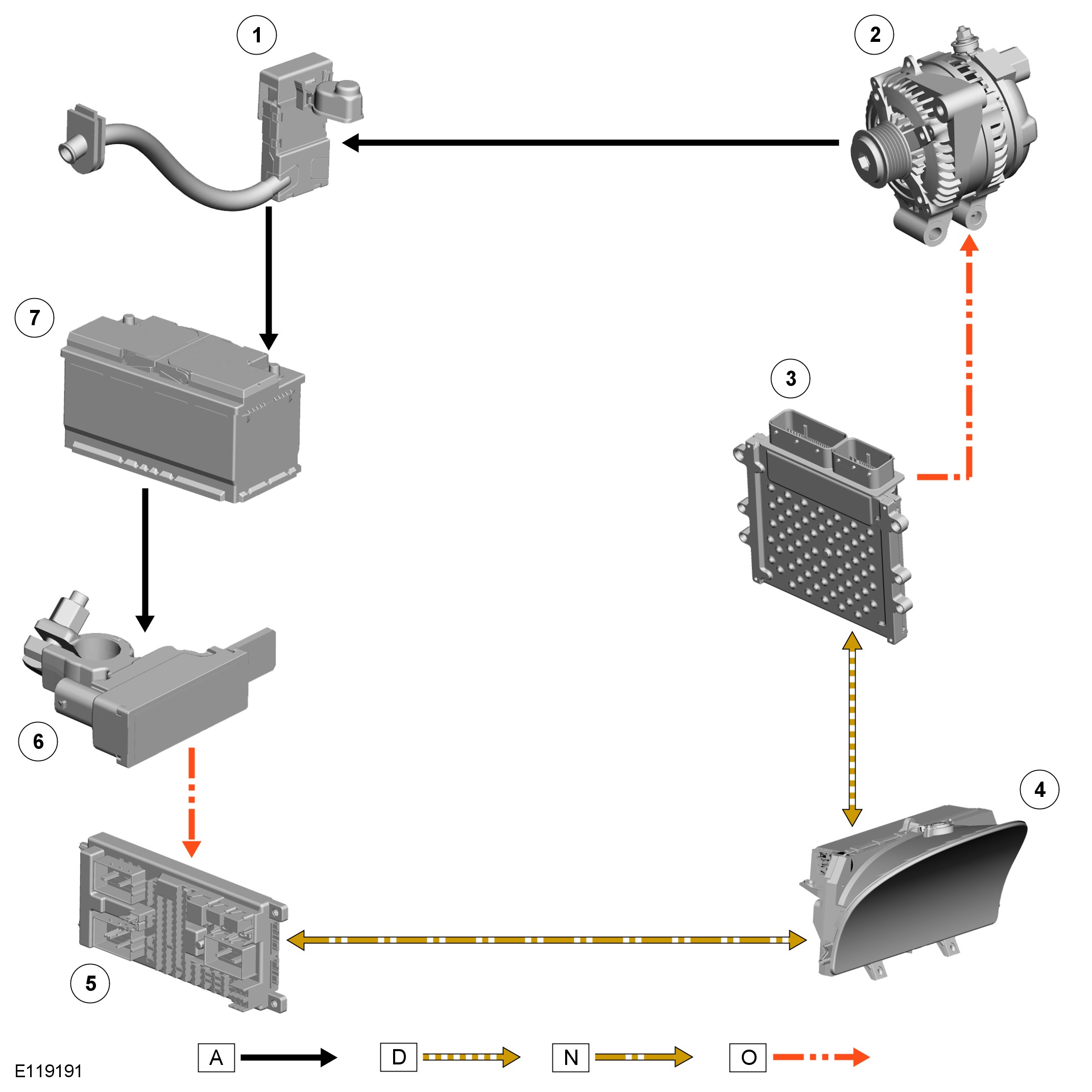 The battery monitoring system signals the required voltage to the ECM (engine control module) via the CJB (central junction box) and the instrument cluster. The ECM (engine control module) then transmits the required voltage on the LIN (local interconnect network) bus connection with the voltage regulator in the generator. The output from the generator is supplied to the battery through the main battery positive cable.