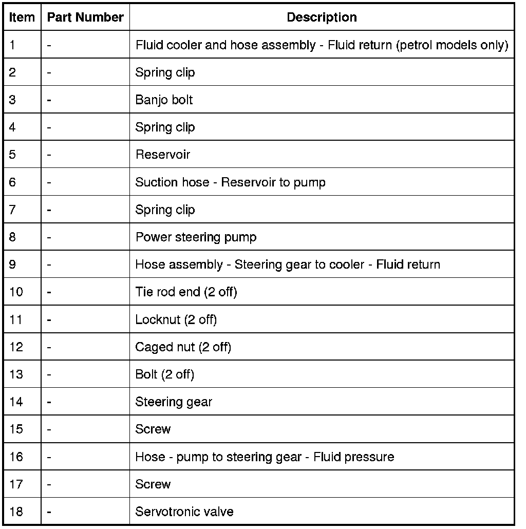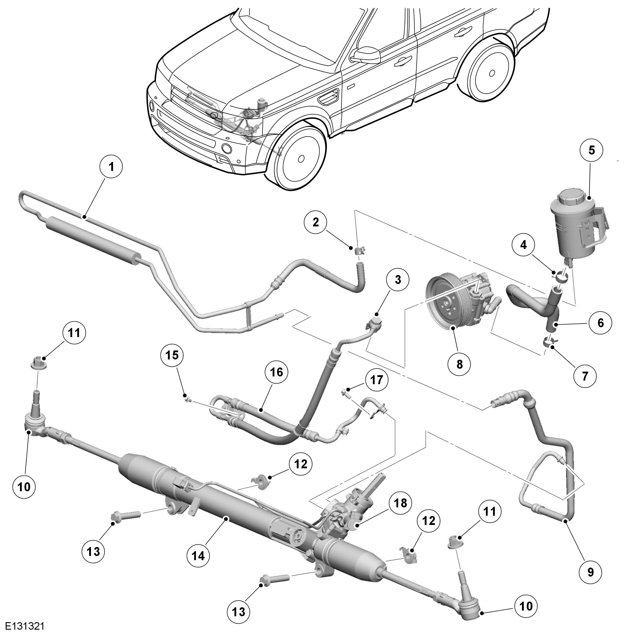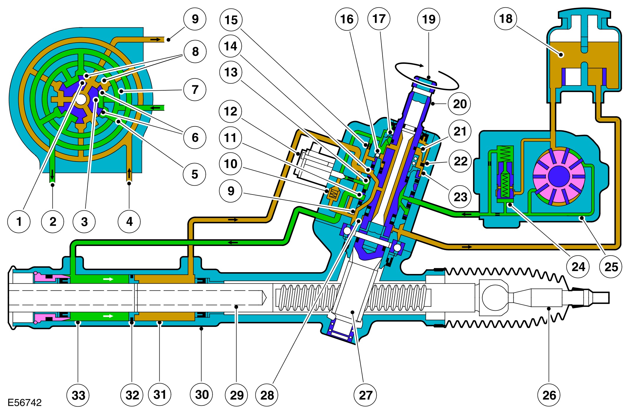 When the engine is started, the power steering pump draws fluid from the reservoir down the low pressure suction line. The fluid passes through the pump and is delivered, via a hose, to the steering rack valve unit.