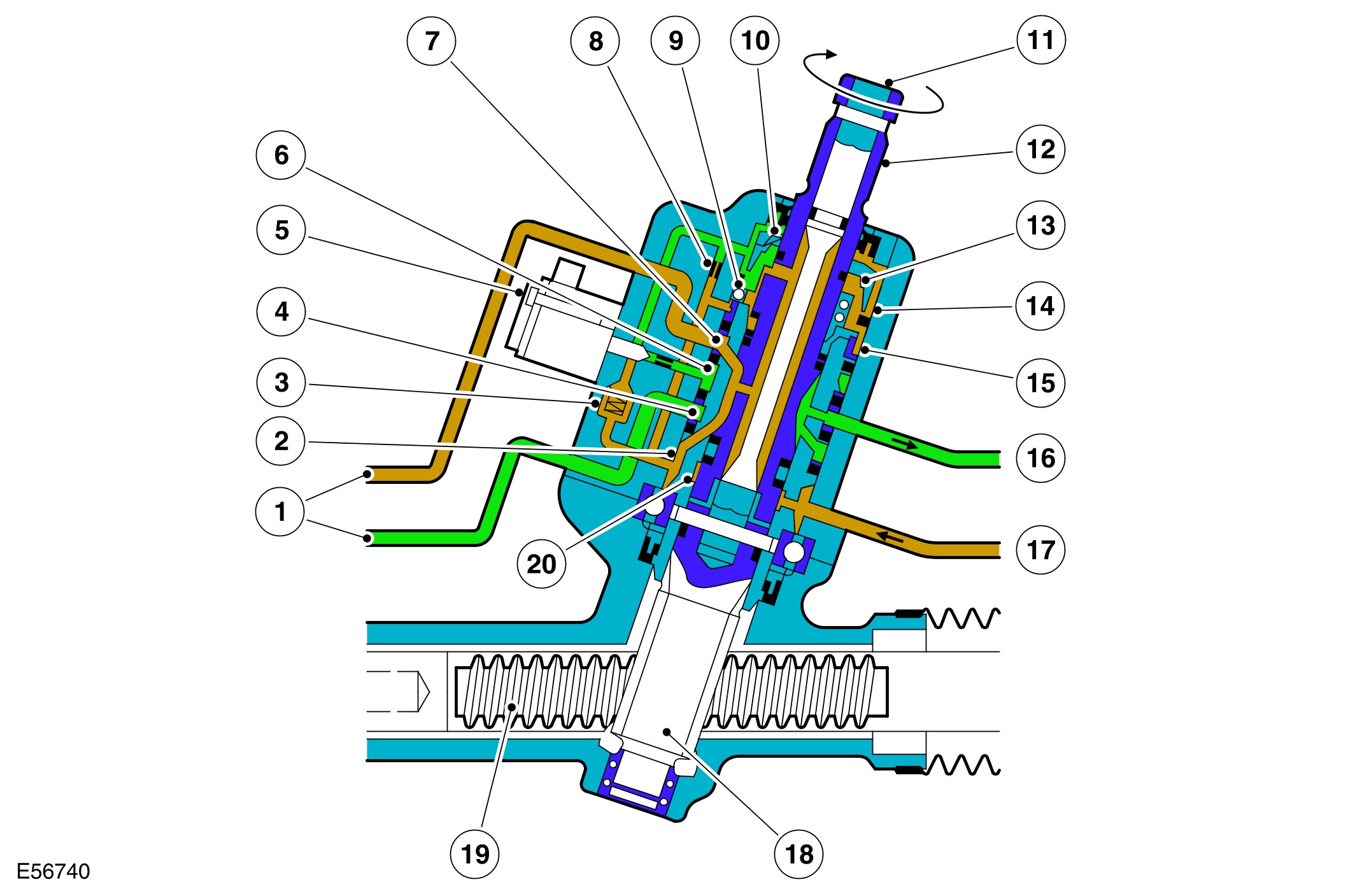 The pump has an internal pressure relief valve and a flow control valve. The pressure relief valve limits the maximum pressure supplied to the steering gear to 115 bar (1667 lbf in2) ± 4 bar (58 lbf in2). The flow control valve limits the maximum flow as follows: