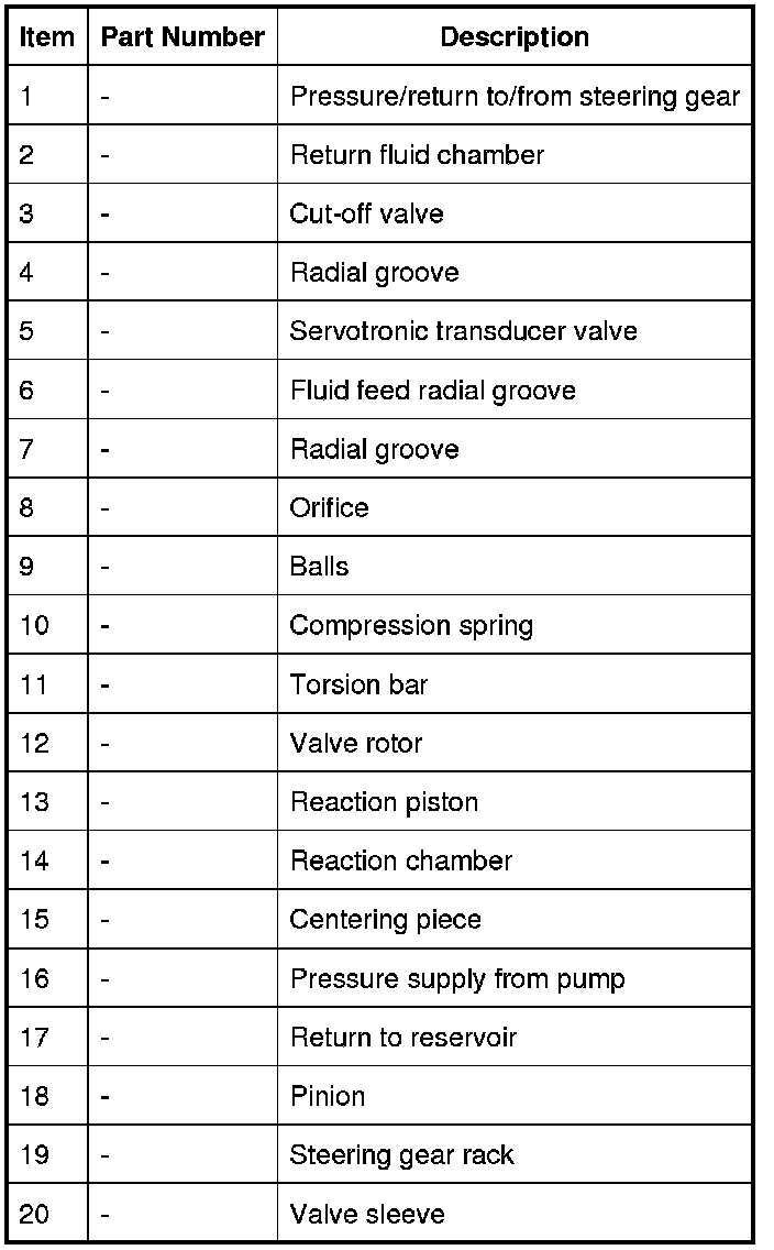 The Servotronic transducer valve is located in a port on the side of the steering gear valve housing. The valve is sealed in the housing with an O-ring seal and is secured with two long screws into threaded holes in the housing. The Servotronic valve is a transducer controlled valve which responds to control signals supplied from the body control module.