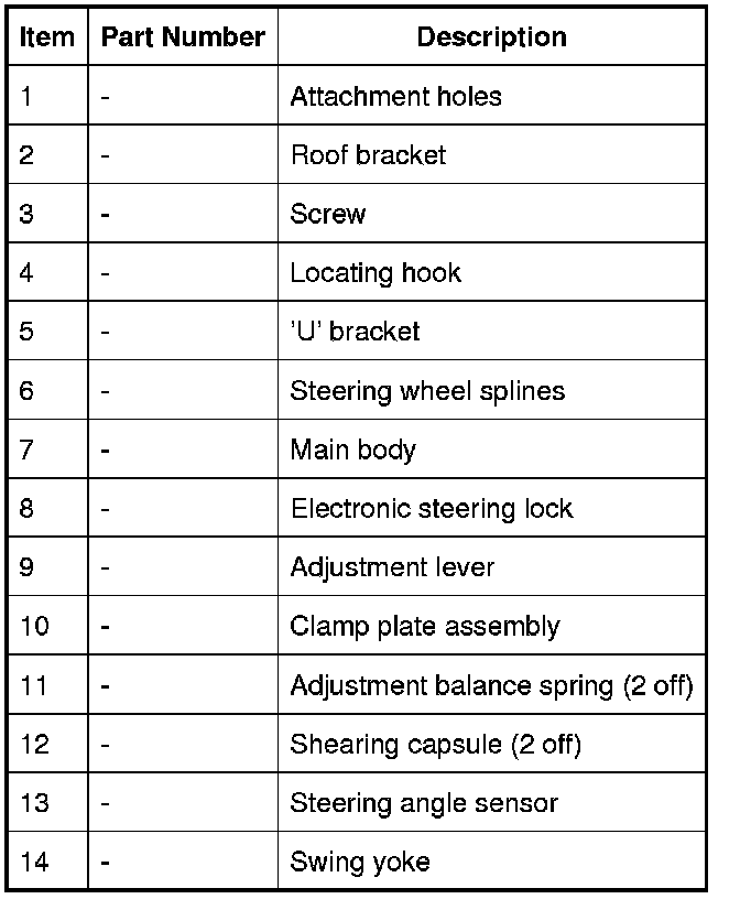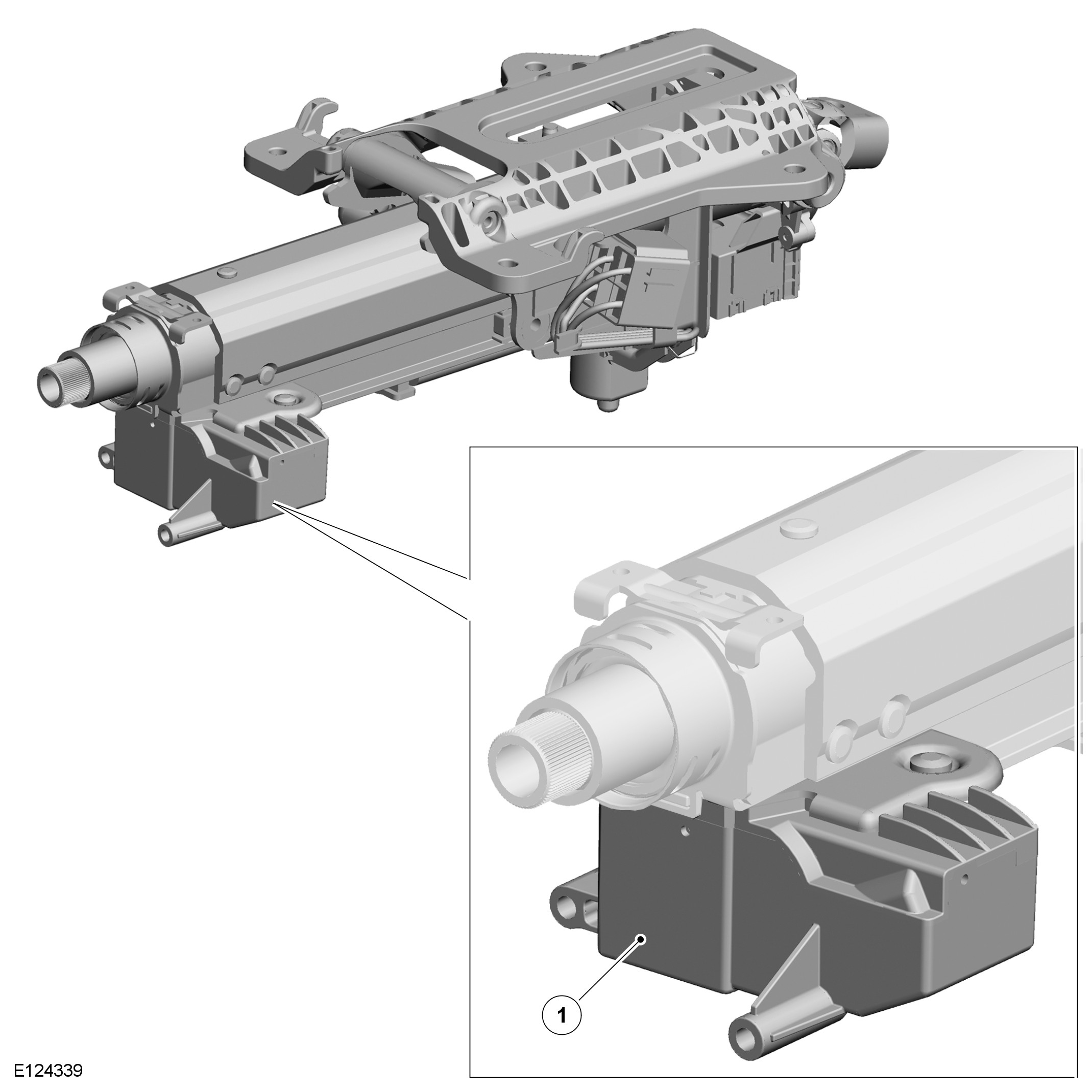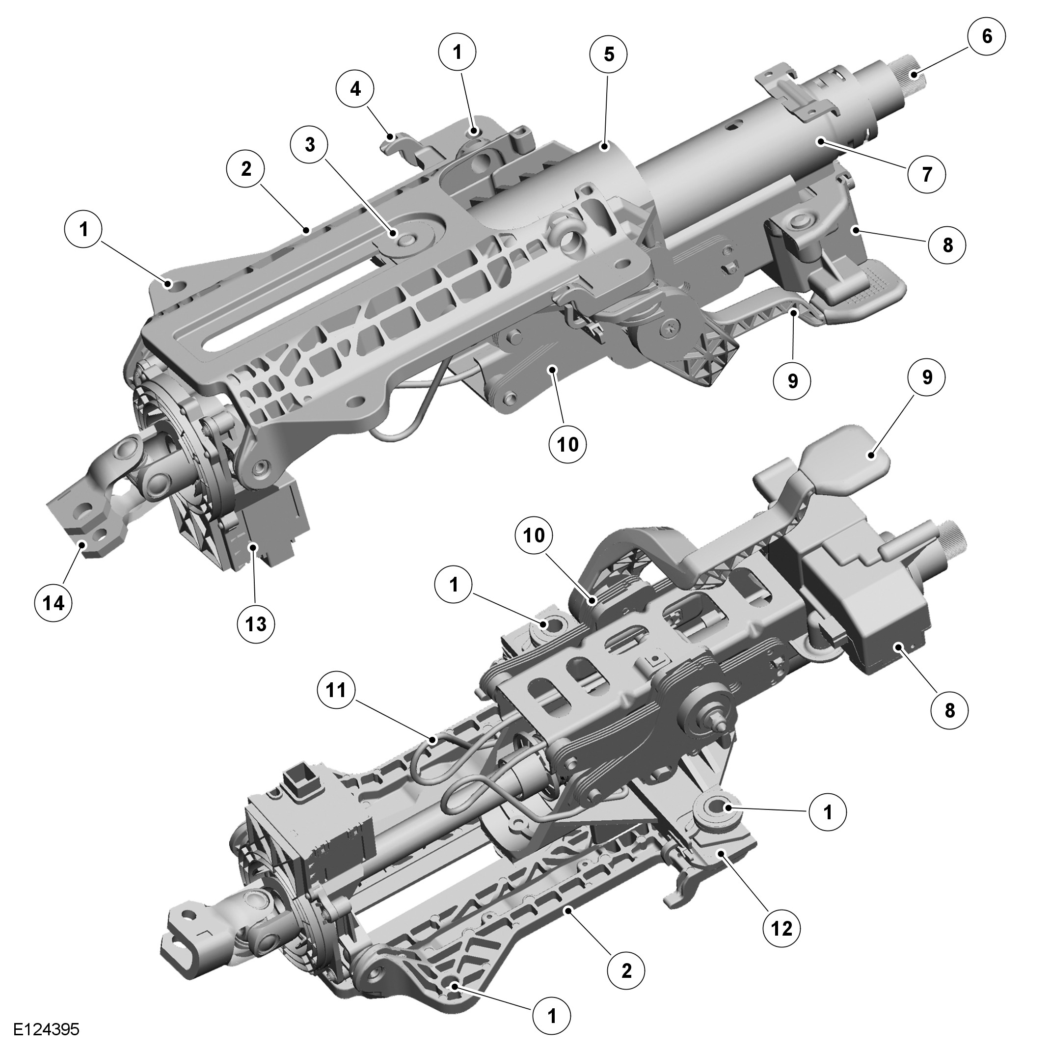 The upper steering column assembly houses the column lock mechanism and control module. The components are assembled with non-removable pins for security reasons and are therefore non-serviceable. Failure of any steering lock components will require replacement of the upper steering column assembly.
