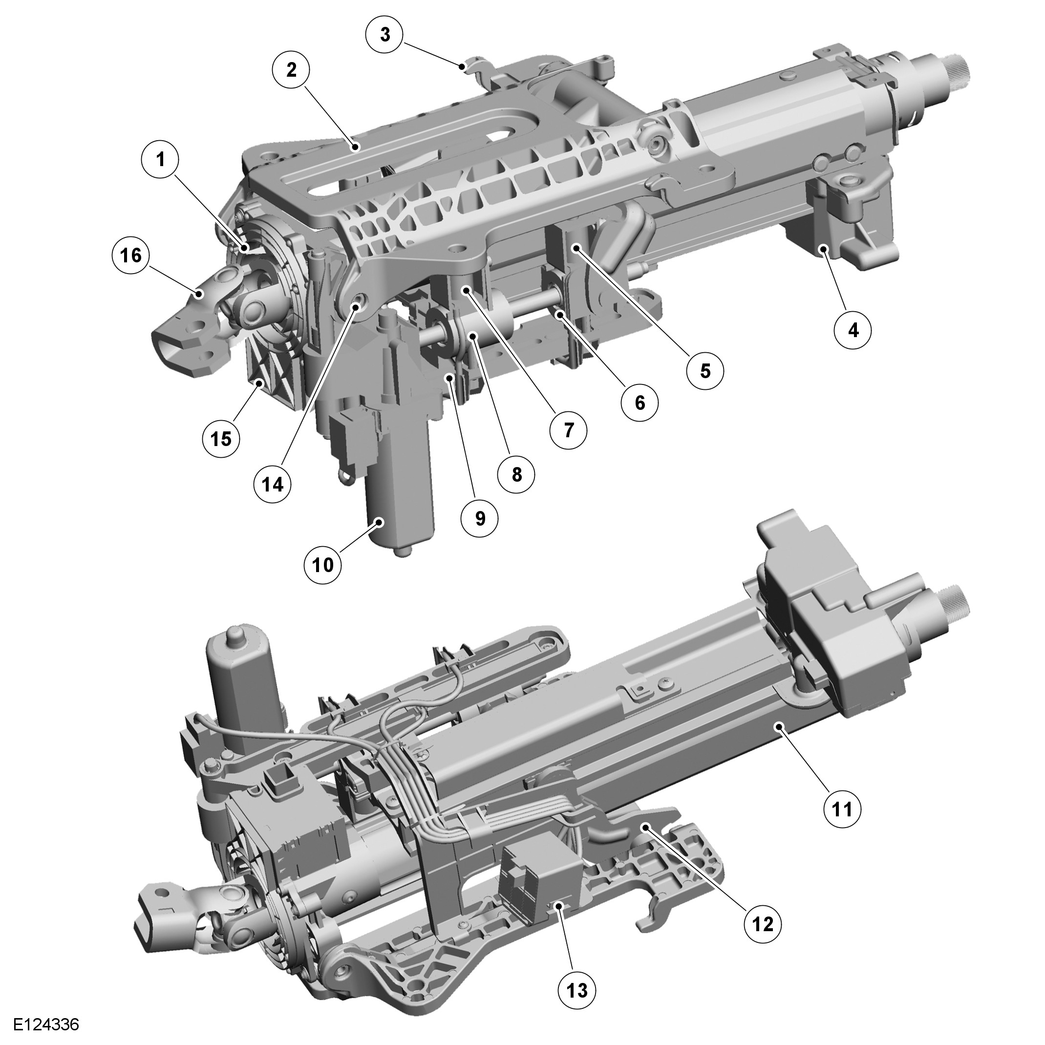 The upper steering column assembly is electronically adjustable for steering wheel reach and rake and is controlled by the CJB (central junction box). The upper steering column assembly also provides the location for the electronic steering lock mechanism and the steering angle sensor.