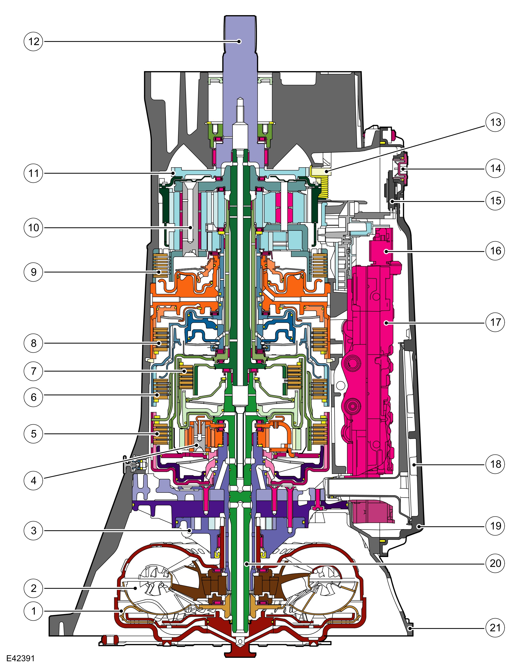 The integral bell housing provides protection for the torque converter assembly and also provides the attachment for the gearbox to the engine. The torque converter is a non-serviceable assembly which also contains the lock-up clutch mechanism. The torque converter drives a crescent type pump via drive tangs. The fluid pump is located in the main casing, behind the torque converter.
