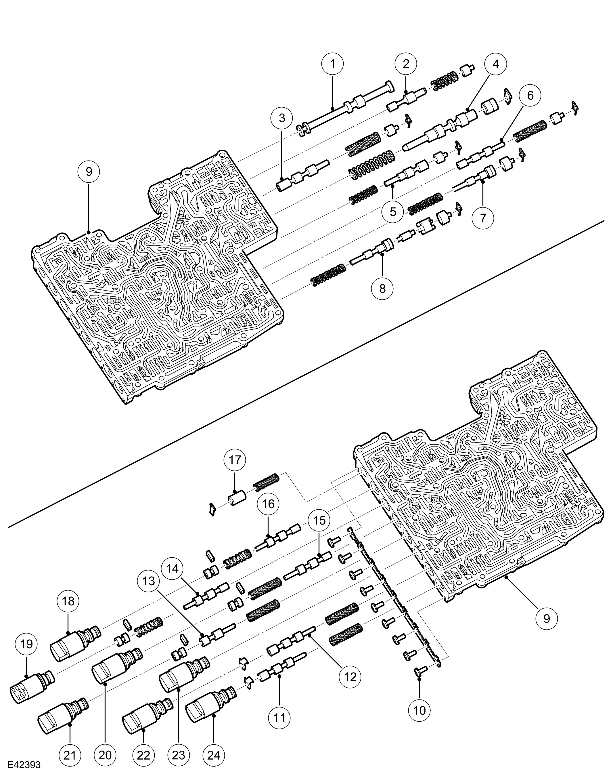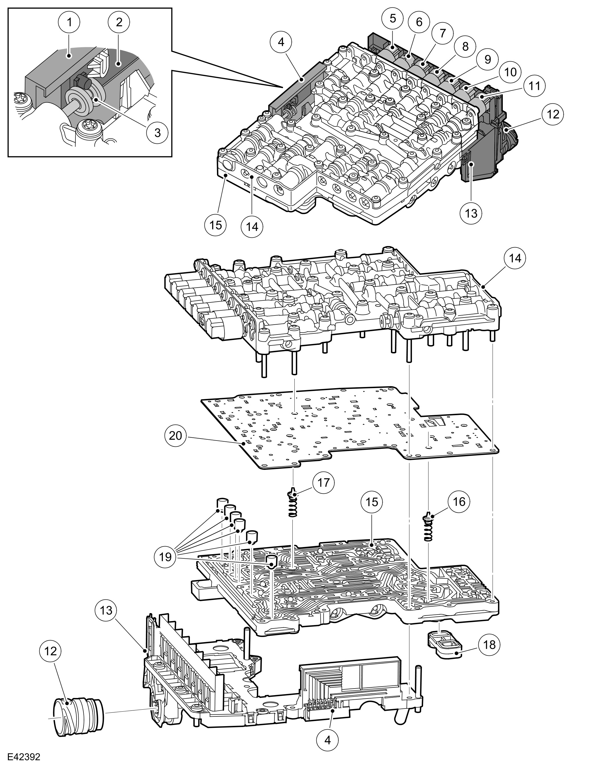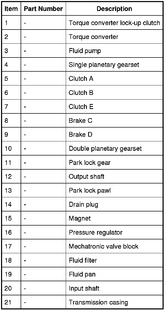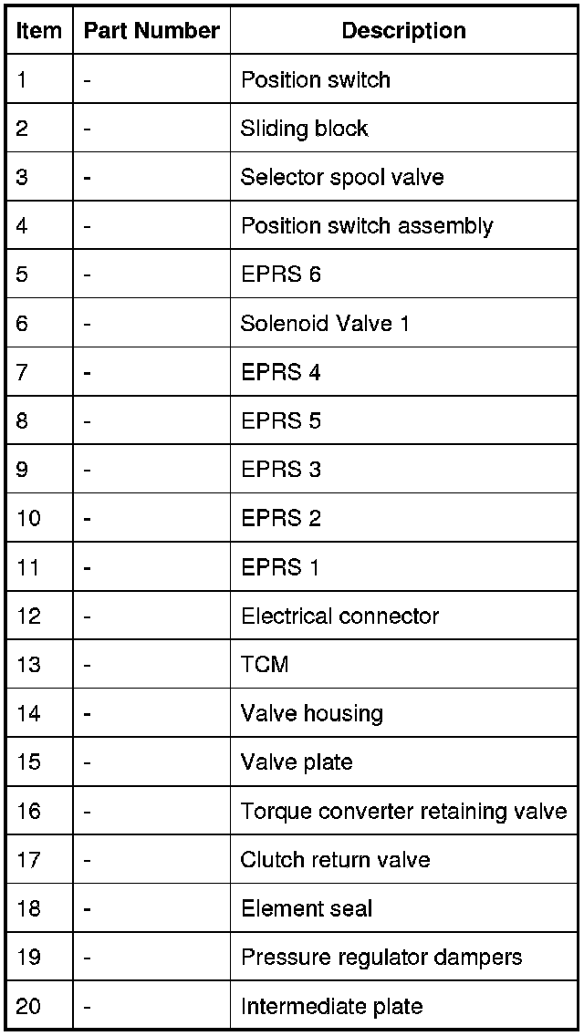 The Mechatronic valve block is located in the bottom of the transmission and is covered by the fluid pan. The valve block houses the TCM (transmission control module), electrical actuators, speed sensors and control valves which provide all electro-hydraulic control for all transmission functions. The Mechatronic valve block comprises the following components: