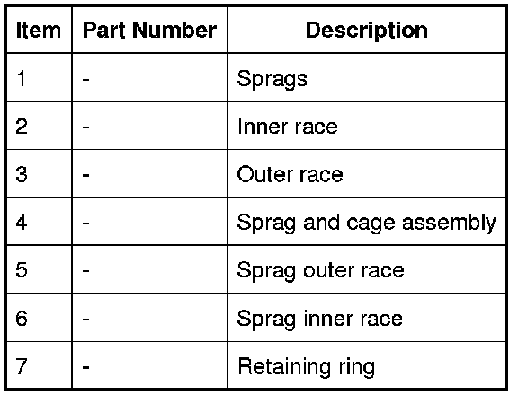 The stator uses a sprag type, one way, freewheel clutch. When the stator is rotated in a clockwise direction the sprags twist and are wedged between the inner and outer races. In this condition the sprags transfer the rotation of the outer race to the inner race which rotates at the same speed.