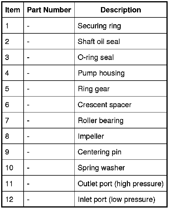 The crescent spacer is fixed in its position by a pin and is located between the ring gear and the impeller. The impeller is driven by drive from the torque converter hub which is located on a needle roller bearing in the pump housing. The impeller teeth mesh with those of the ring gear. When the impeller is rotated, the motion is transferred to the ring gear which rotates in the same direction.