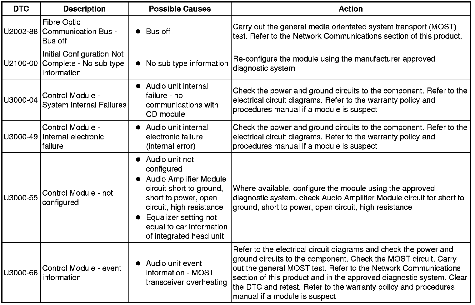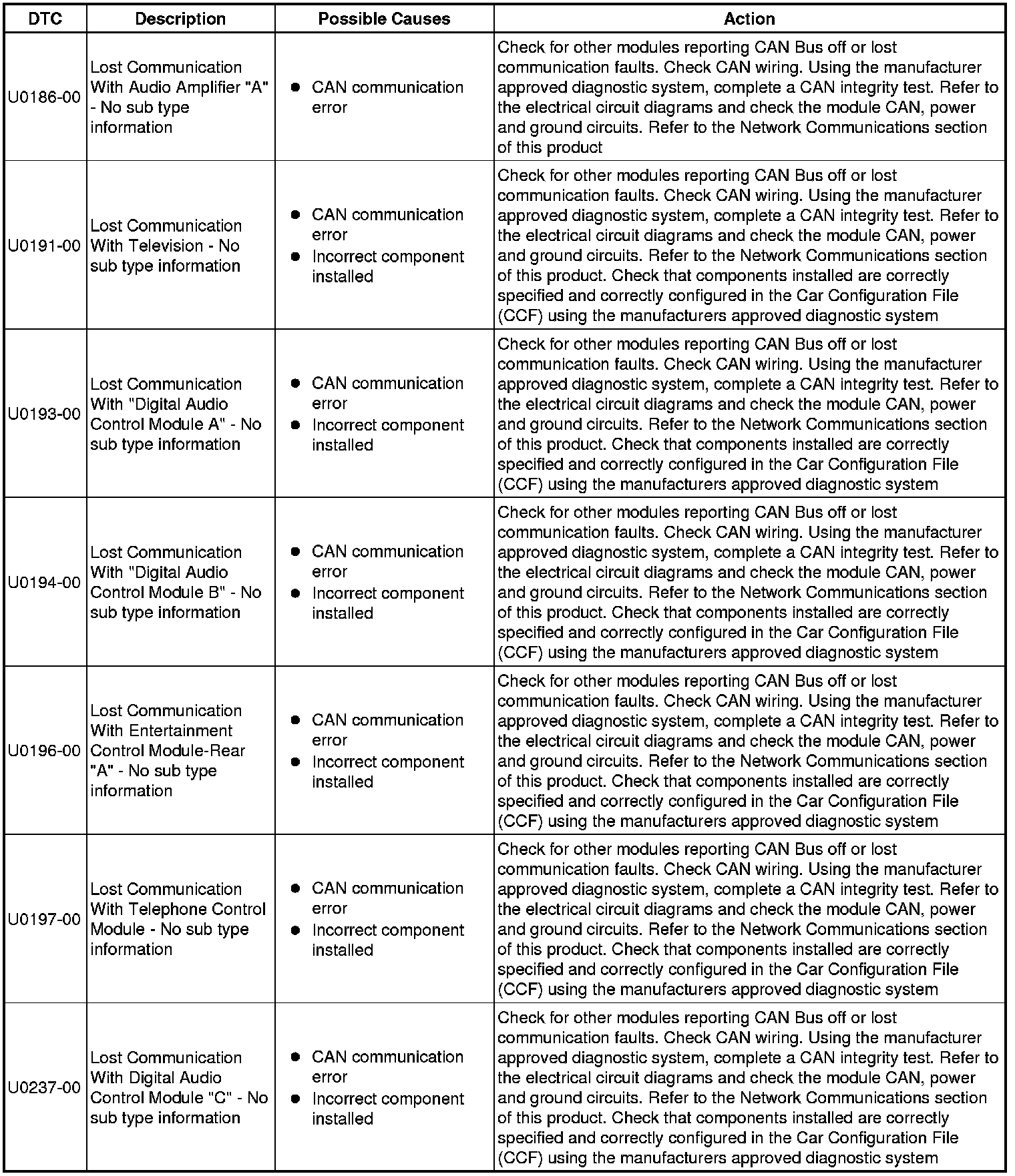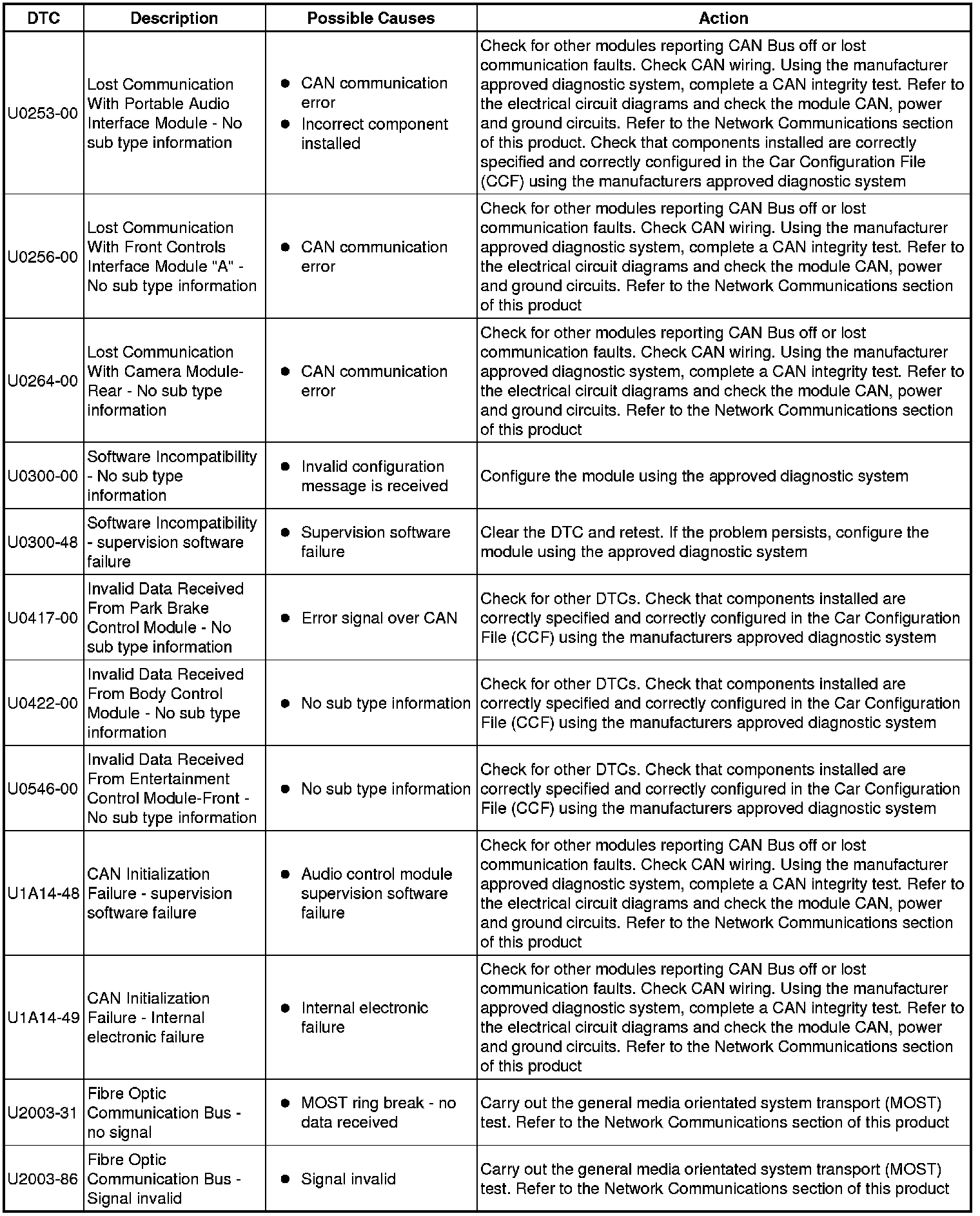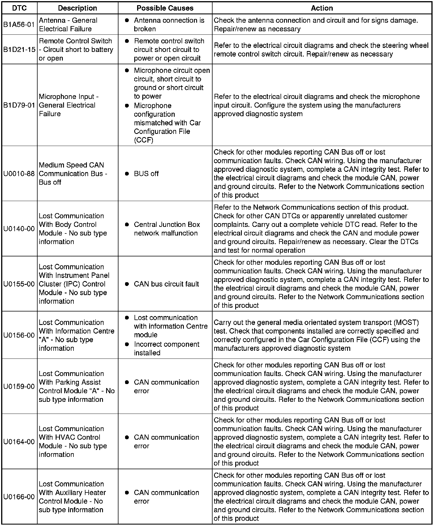 The table below lists all Diagnostic Trouble Codes (DTCs) that could be logged in the Audio Control Module, for additional Diagnosis and Testing information refer to the relevant Diagnosis and Testing Section. For additional information, refer to Information and Entertainment System Information and Entertainment System