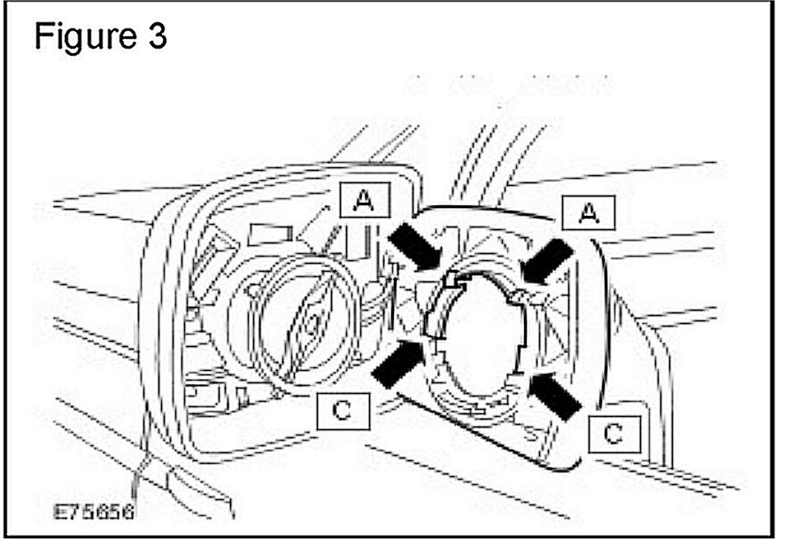 The two locating ribs, identified as "C" may fracture during mirror detachment. This is normal and does not affect the reinstallation, retention or function of the mirror glass and should not be replaced. (Figure 3)