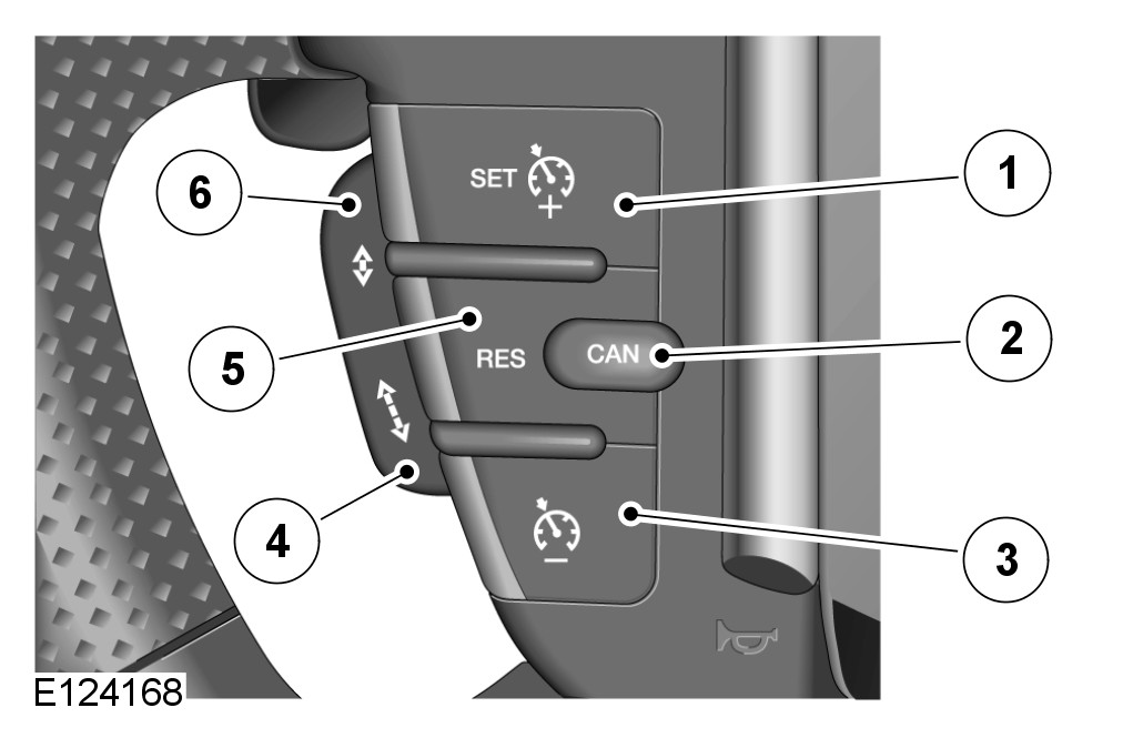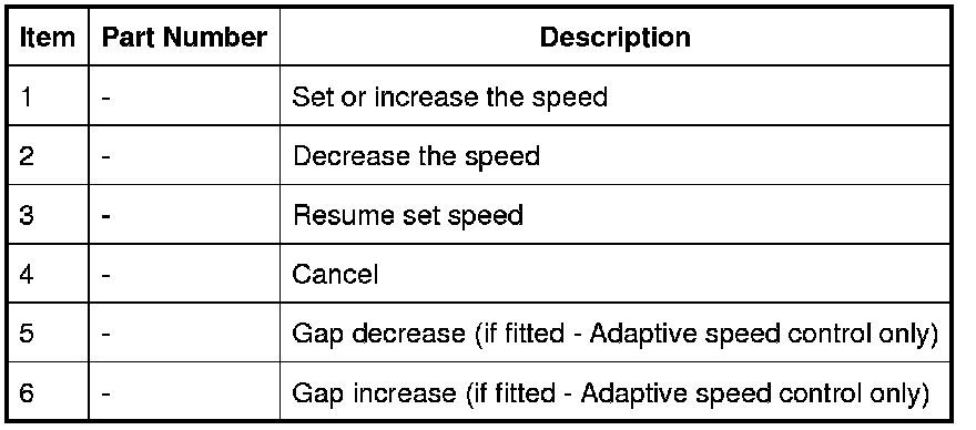 Speed control is engaged by pressing the set/increase switch. Once engaged the speed can be varied by the speed adjustment switches. Each press of the speed adjustment switches will increase or decrease the set speed in steps of 1 mph (2 kph).