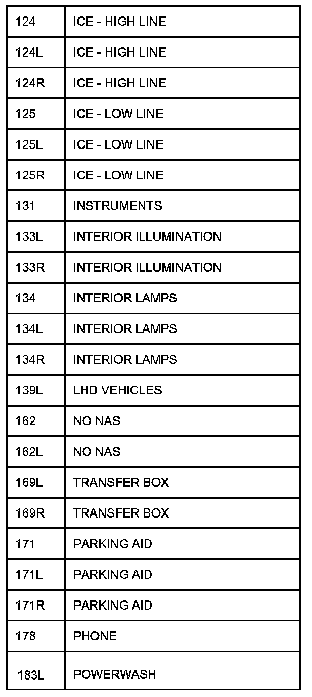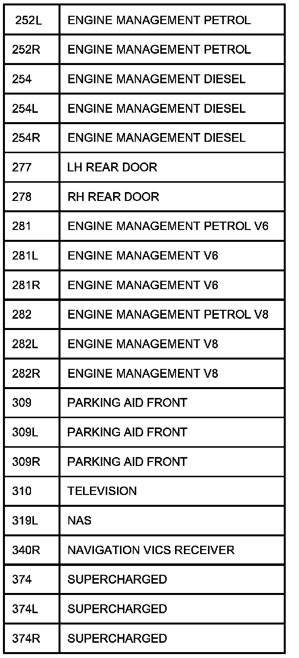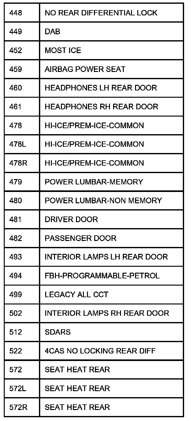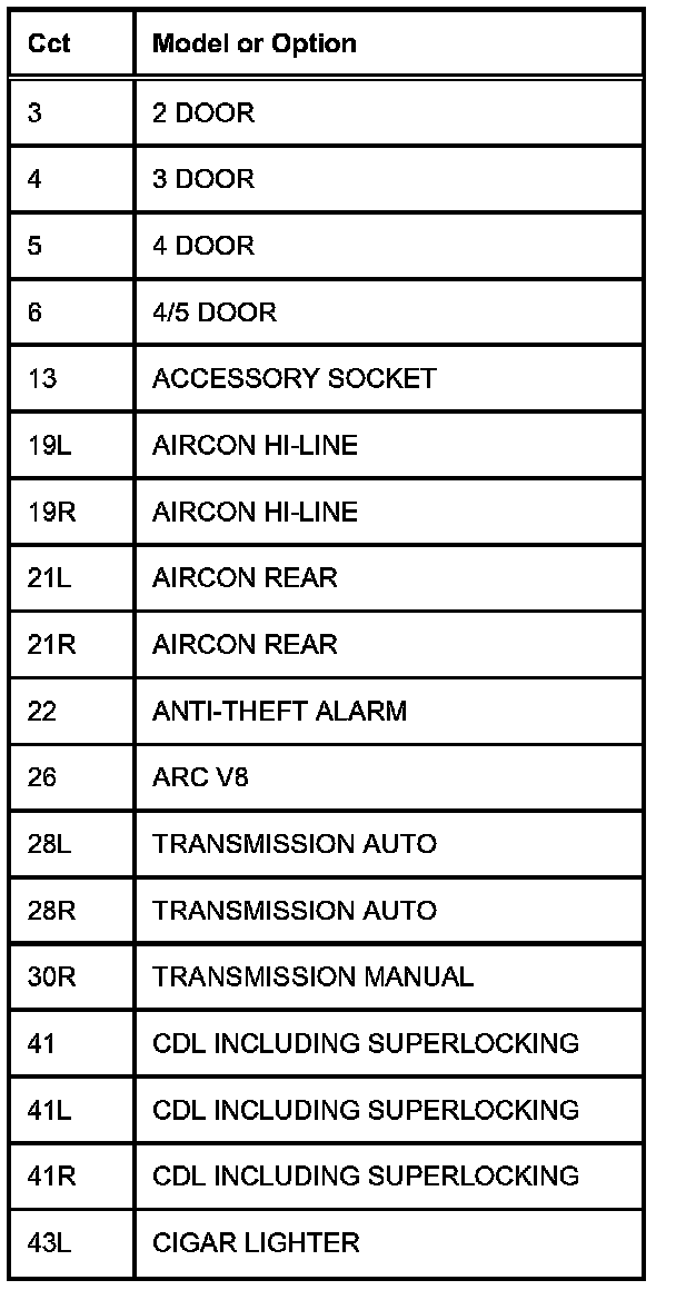 The following table contains a list of circuit (Cct) reference numbers against a description of the applicable model or option. This information should be used in conjunction with the connector pin-out tables to determine the wire configuration of the vehicle under test.