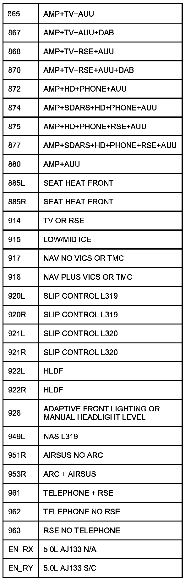 Table of Circuit Option Codes