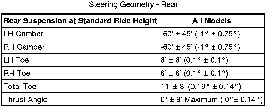 CAUTION: When checking or adjusting front or rear steering geometry, the vehicle must either have a full fuel tank or have sufficient weight placed in the vehicle's load space to give the equivalent weight of a full fuel tank. The weight must be evenly distributed at the front and the right hand side of the load space. The fuel tank capacity is 86.3 liters (18.9 Imperial gallons) (22.7 US gallons). Depending on the amount of fuel in the tank, calculate the amount of weight which must be added: