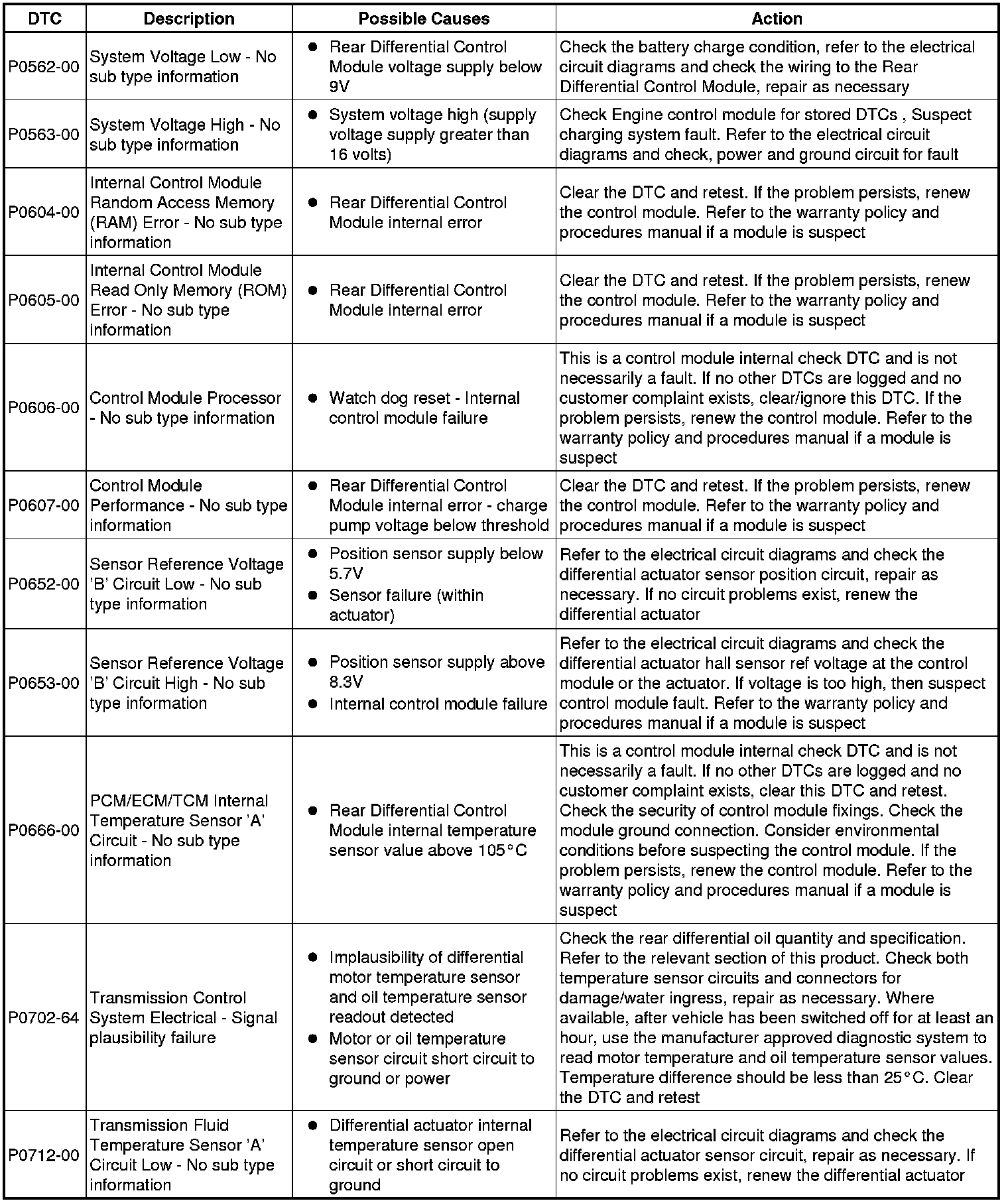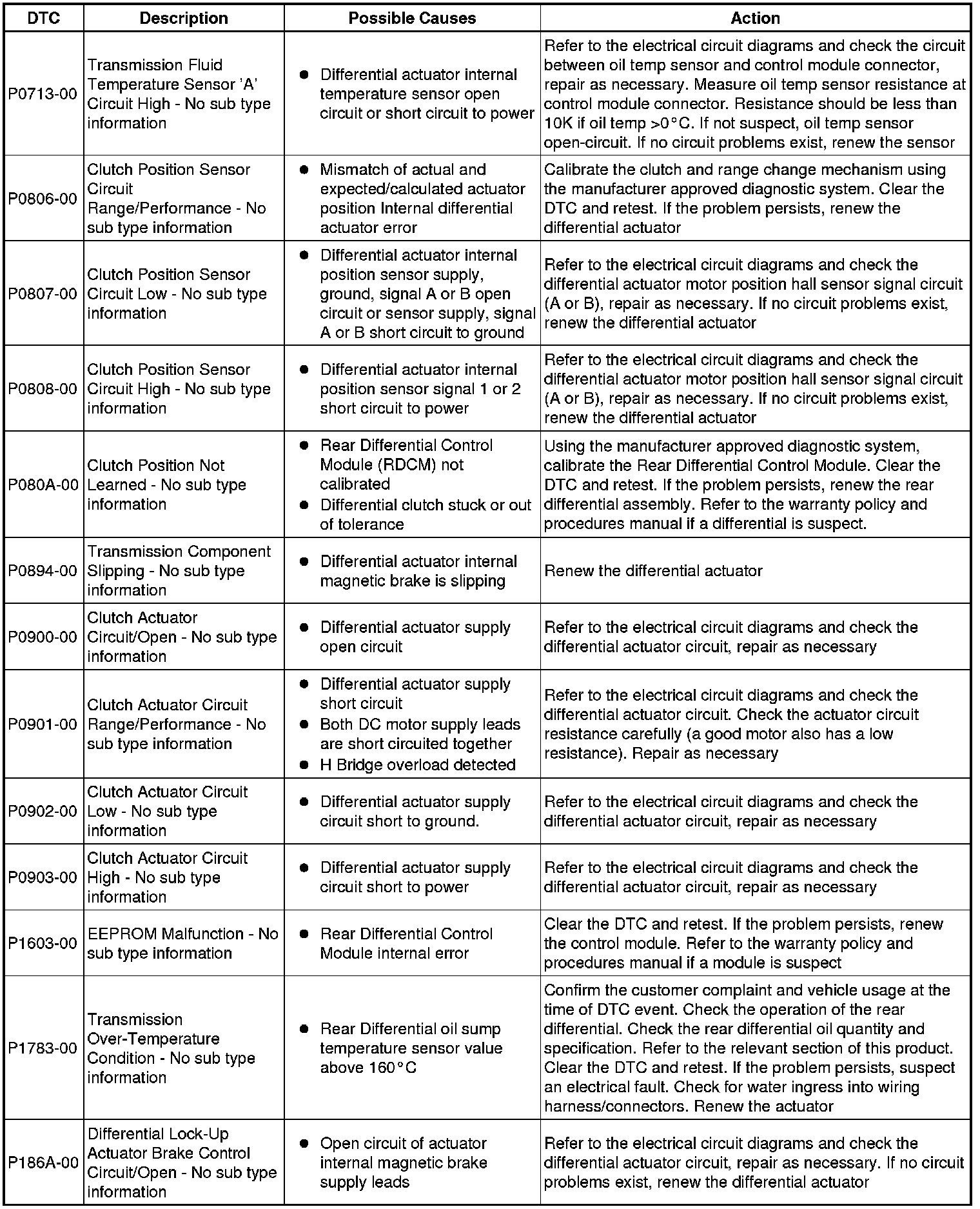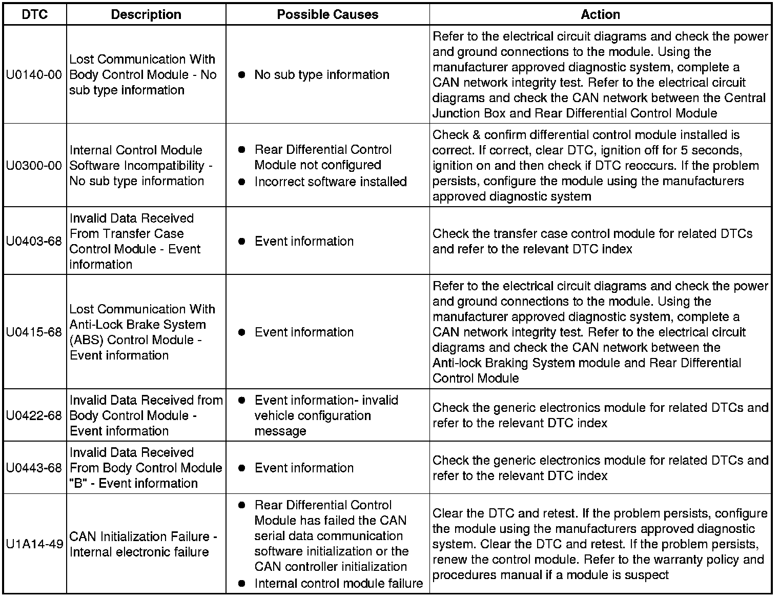 The table below lists all Diagnostic Trouble Codes (DTCs) that could be logged in the Rear Differential Control Module, for additional Diagnosis and Testing information refer to the relevant Diagnosis and Testing Section. For additional information, refer to Rear Drive Axle and Differential Initial Inspection and Diagnostic Overview