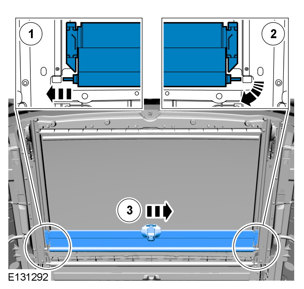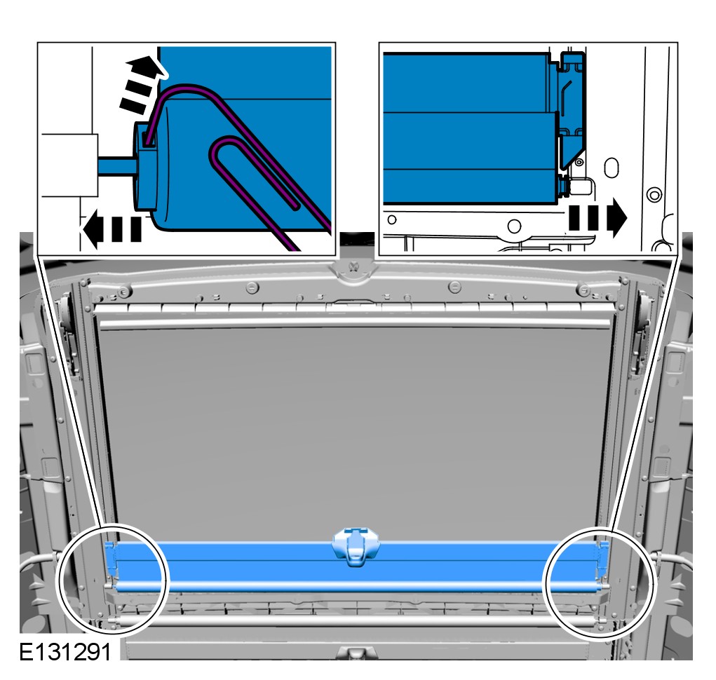 4 Release the roof opening panel blind from the mounting bracket and remove the roof opening panel blind from the vehicle.