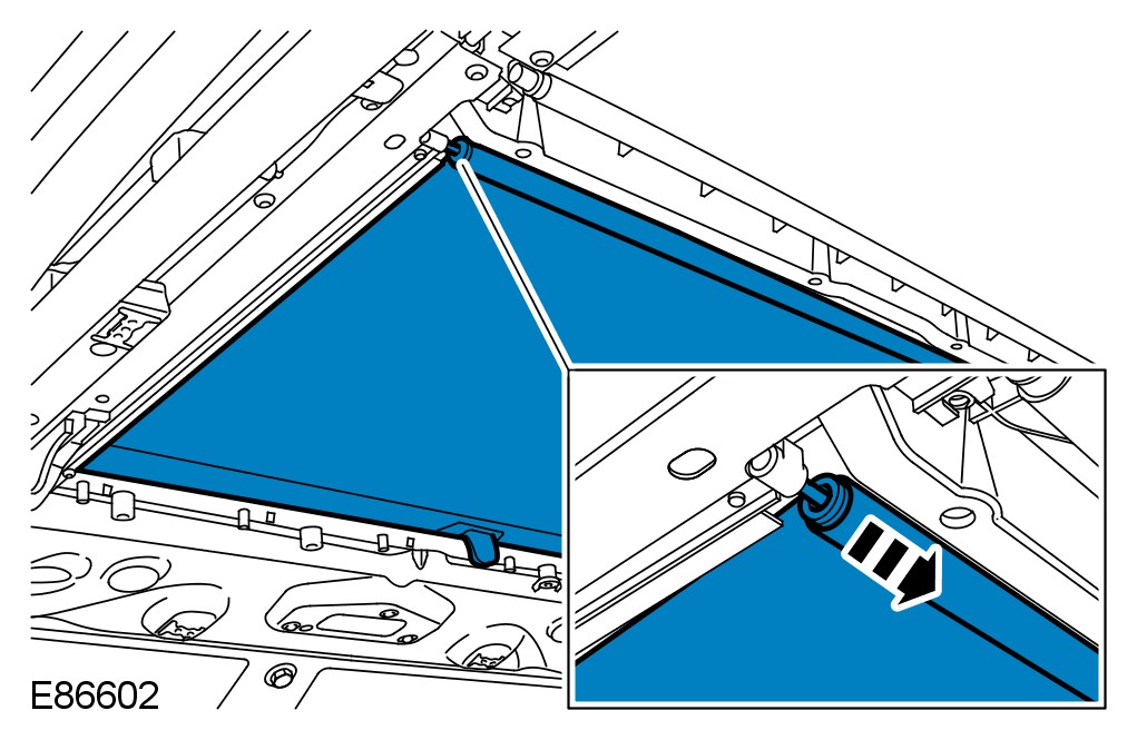 CAUTION: Do not allow the roof opening panel blind tube to rotate until the plastic pin is secure in its locator.