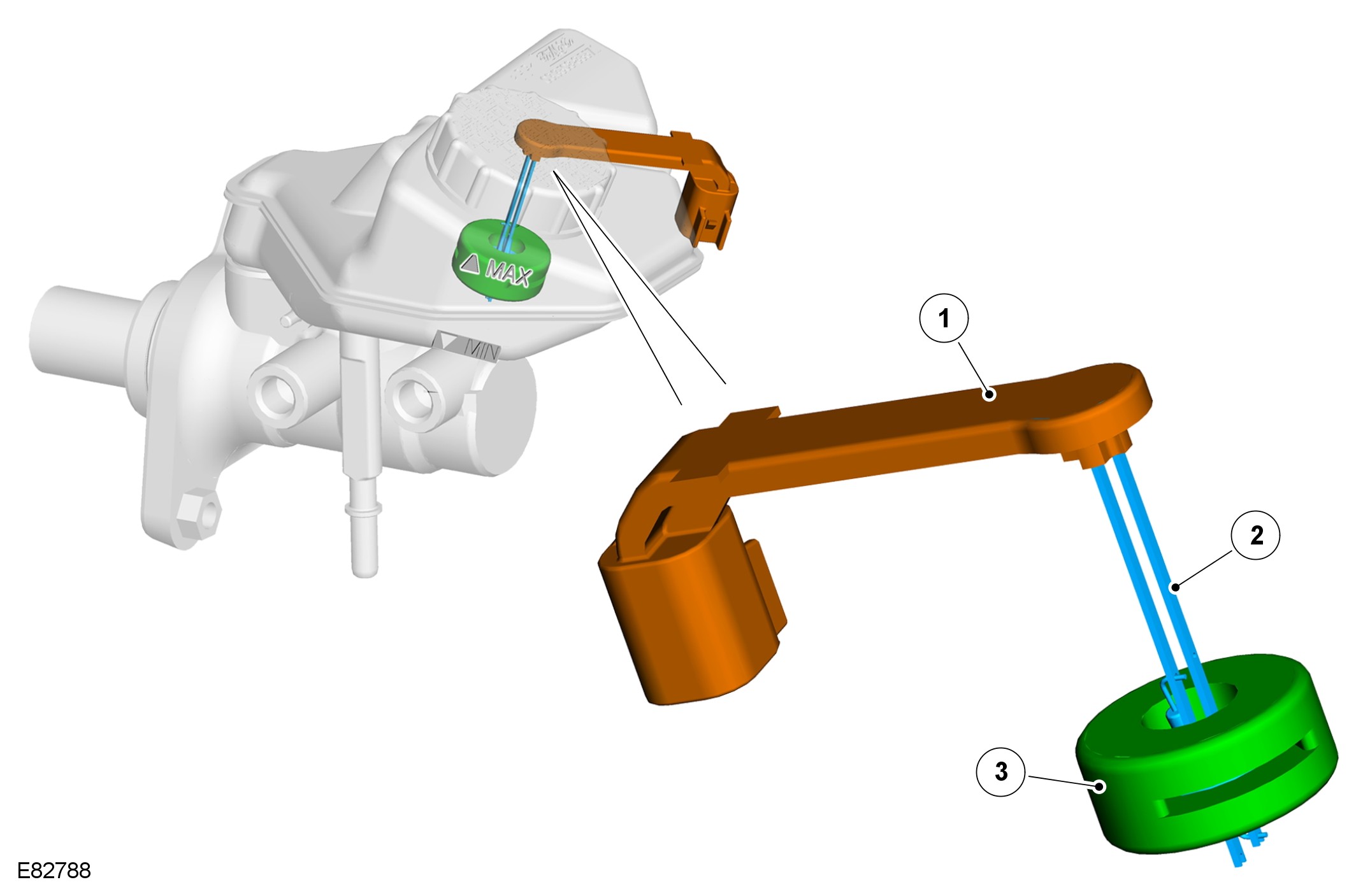 The reservoir incorporates a brake fluid level switch that is hardwired to the Central Junction Box (CJB). When the reservoir fluid falls to a predetermined low level, the switch contacts close and provide a signal feed back to the CJB. The CJB then broadcasts a message on the medium speed Controller Area Network (CAN) bus to the instrument cluster that in turn illuminates the brake fluid warning indicator lamp. For additional information, refer to Instrument Cluster Initial Inspection and Diagnostic Overview