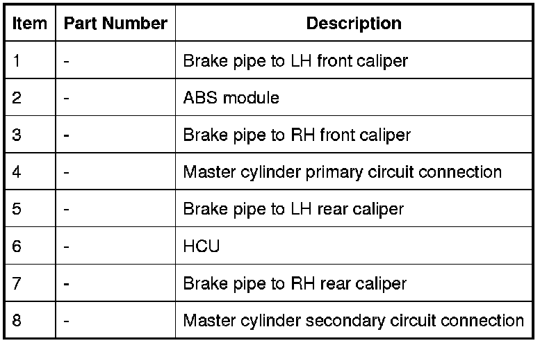 The primary and secondary outlet ports of the master cylinder are connected via 8 mm (0.315 in) diameter brake pipes to the primary and secondary circuits of the HCU. The primary circuit in the HCU provides 2 separate outlet ports to the RH front and LH rear brakes. The secondary circuit in the HCU provides 2 separate outlet ports to the LH front and RH rear brakes.
