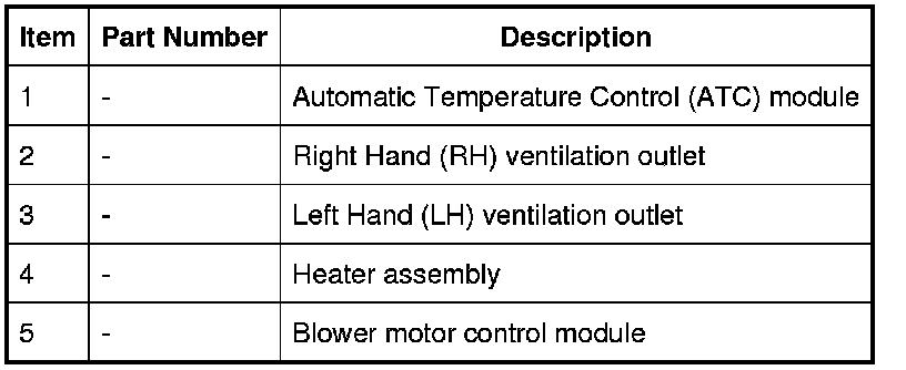 The heater assembly controls the temperature of the air supplied to the air distribution ducts, as directed by the ATC module. The heater assembly is mounted on the vehicle center line and comprises the following components: