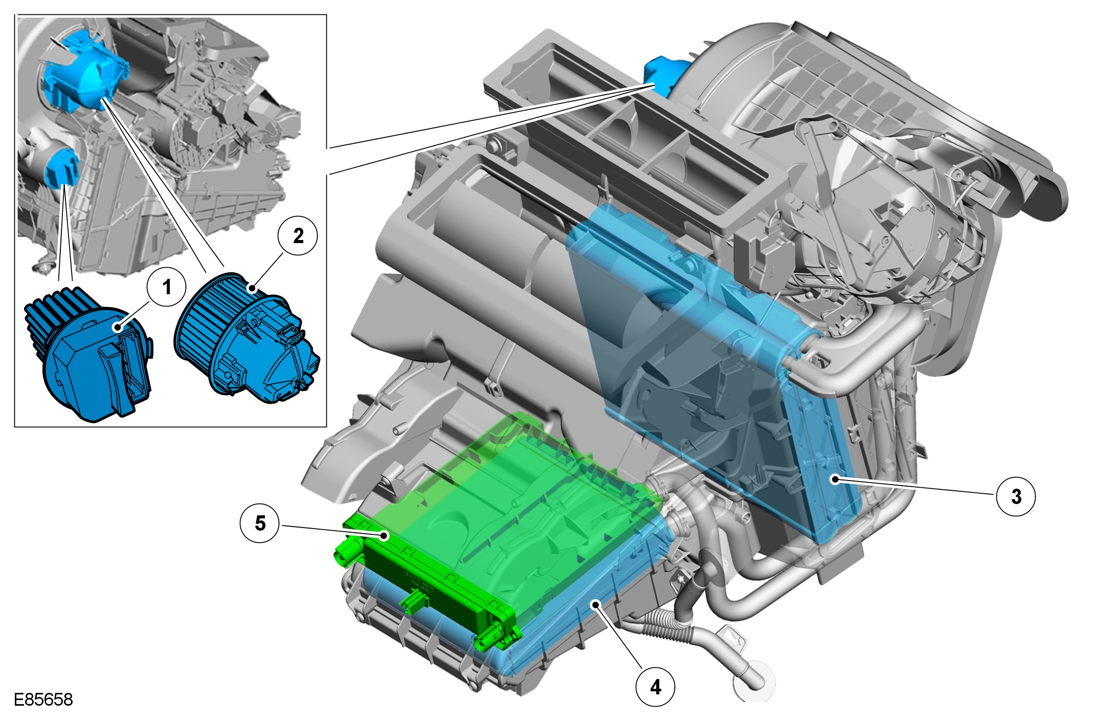 The ATC module controls operation of the blower motor via the blower motor control module, which is mounted on the bulkhead side of the heater assembly casing.For additional information, refer to Air Distribution and Filtering Air Distribution and Filtering
