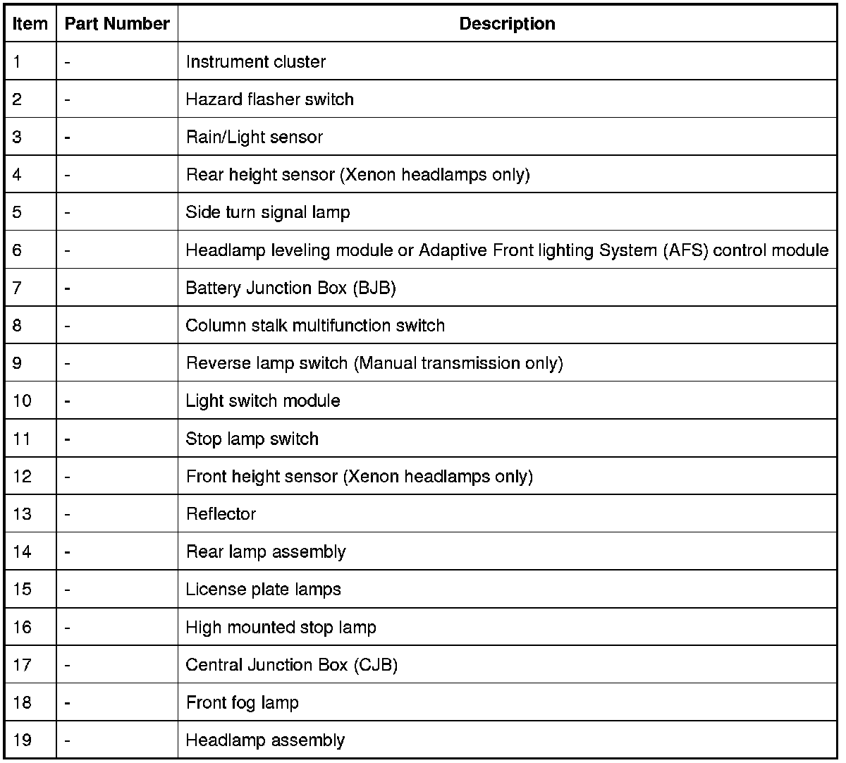 The exterior lighting is controlled by the CJB. The CJB is the main controlling module for vehicle body systems and is located behind the glovebox in the instrument panel.