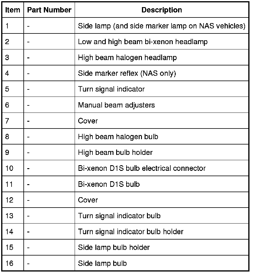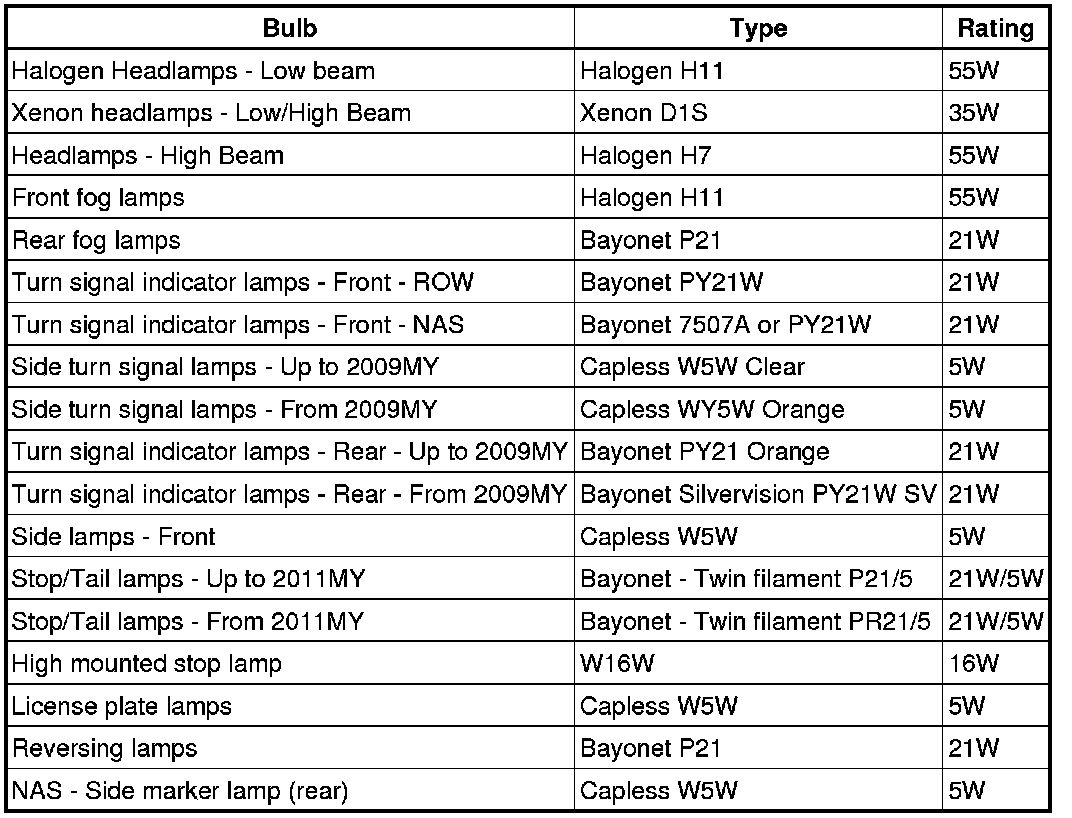 The following table shows the bulbs used for the exterior lighting system and their type and specification.