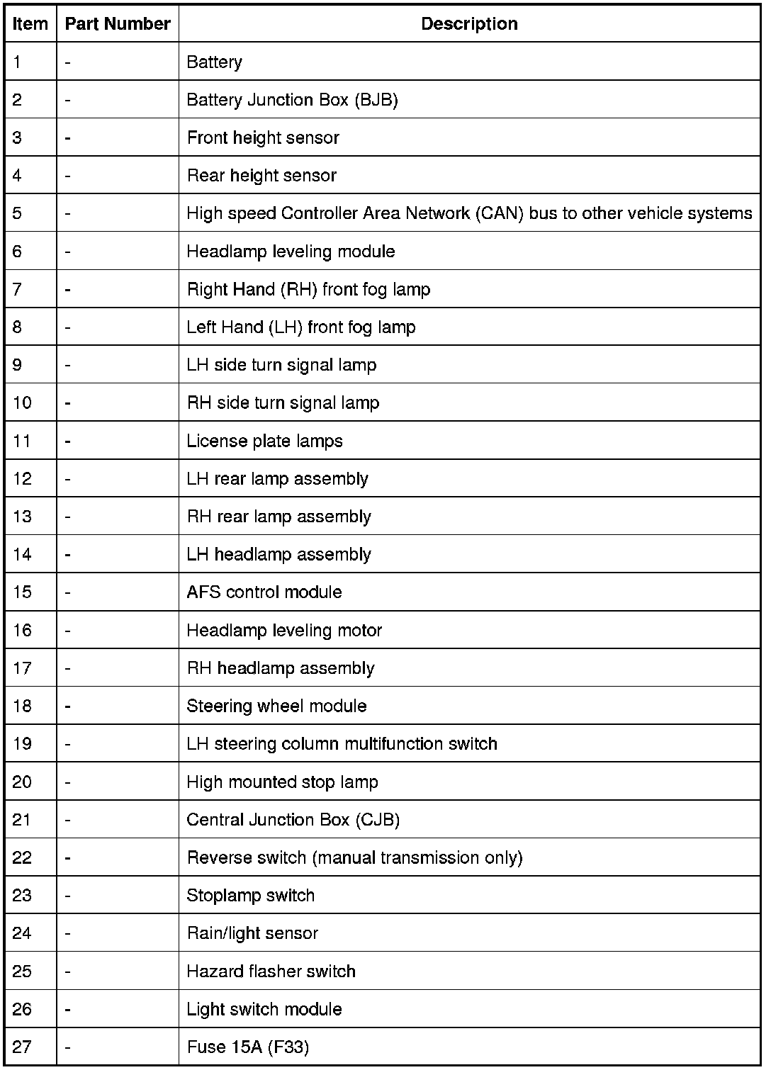 Two 60 Amp fusible links in the battery junction box protect the power feed to the CJB LH and RH lighting circuits respectively. All exterior lighting circuits are protected by Field Effect Transistors (FETs), located in the CJB, which can detect overloads and short circuits.