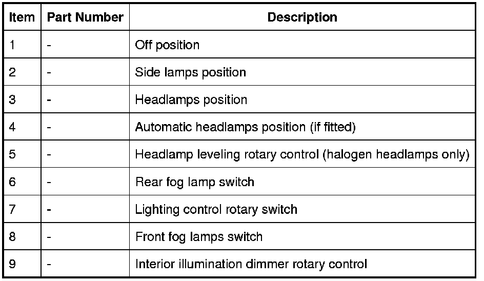 The light switch module is located in the driver's side of the instrument panel and allows the driver to control the operation of the exterior lighting system. Three variants of the module are available to cover different vehicle specifications and market variants.
