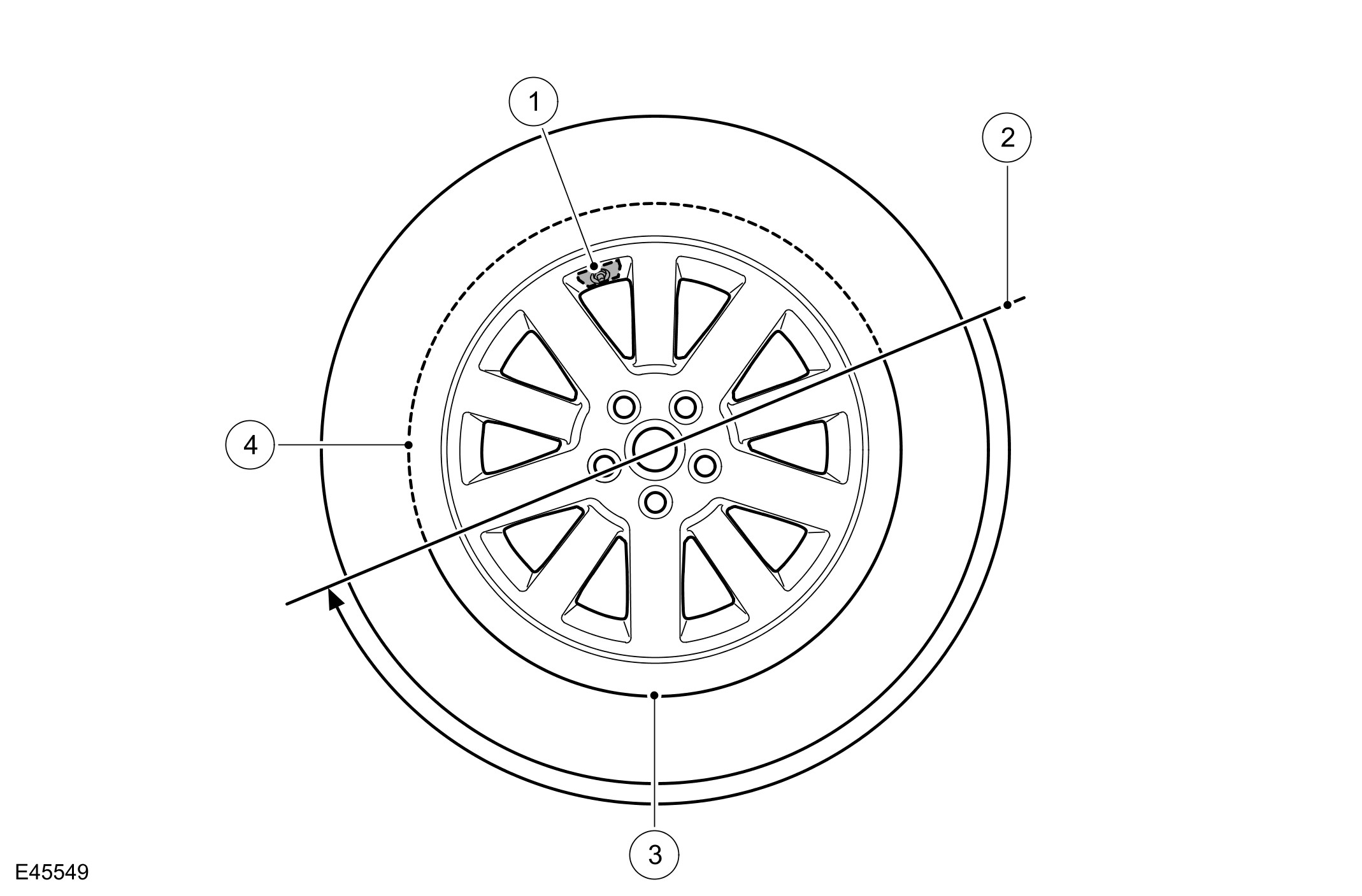 When refitting the tire, position the fitting arm as shown. Rotate the tire and take care that the bead on the low tension side of the tire does not damage the sensor.