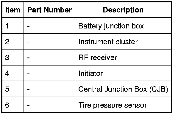 The system comprises a Radio Frequency (RF) receiver, 4 initiators and 4 tire pressure sensors (5 if the spare wheel has a sensor fitted).