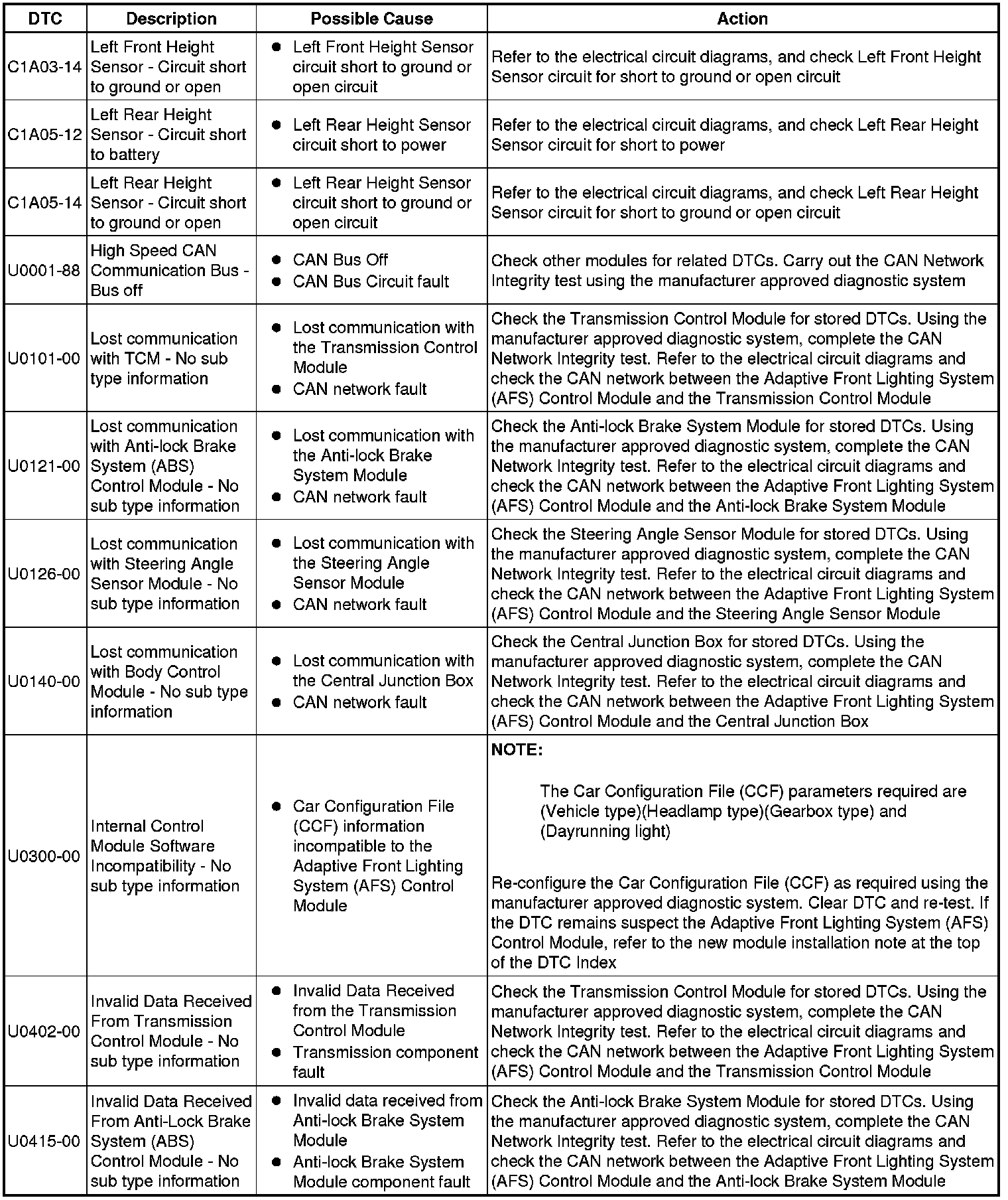 Generic scan tools may not read the codes listed, or may read only 5-digit codes. Match the 5 digits from the scan tool to the first 5 digits of the 7-digit code listed to identify the fault (the last 2 digits give extra information read by the manufacturer-approved diagnostic system).