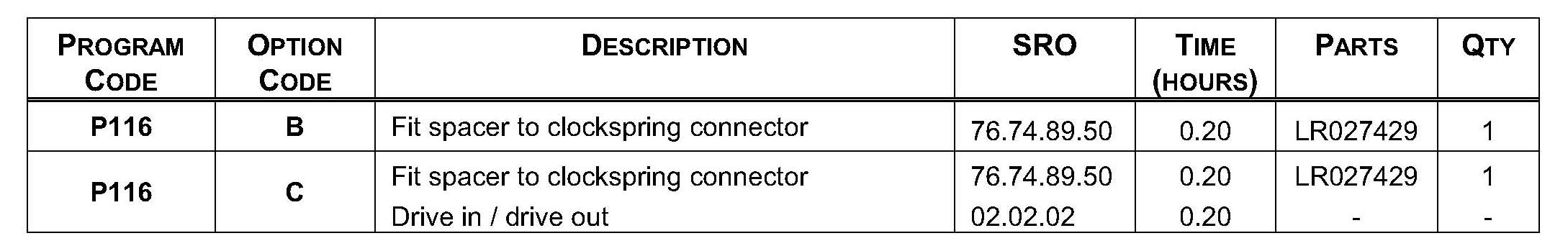 Warranty claims should be submitted quoting the Program Code 'P116' together with the relevant Option Code 'B' or 'C'. As Option Codes are used, there is no requirement to enter SRO or parts; these are repeated for information only. The option that allows for the drive in / drive out allowance may only be claimed if the vehicle is brought back into the workshop for this action alone to be undertaken.