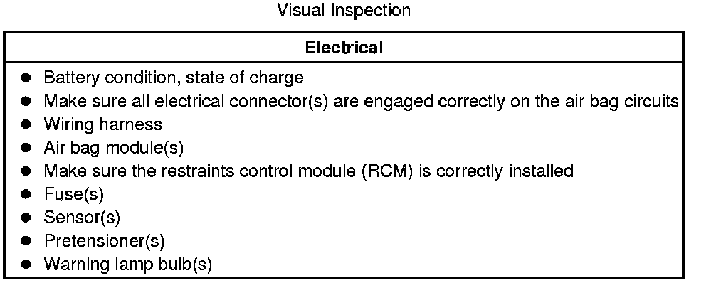 4 If the cause is not visually evident, check Restraints Control Module (RCM) and Occupancy Classification System (OCS) module for Diagnostic Trouble Codes (DTCs) and refer to the DTC Index.