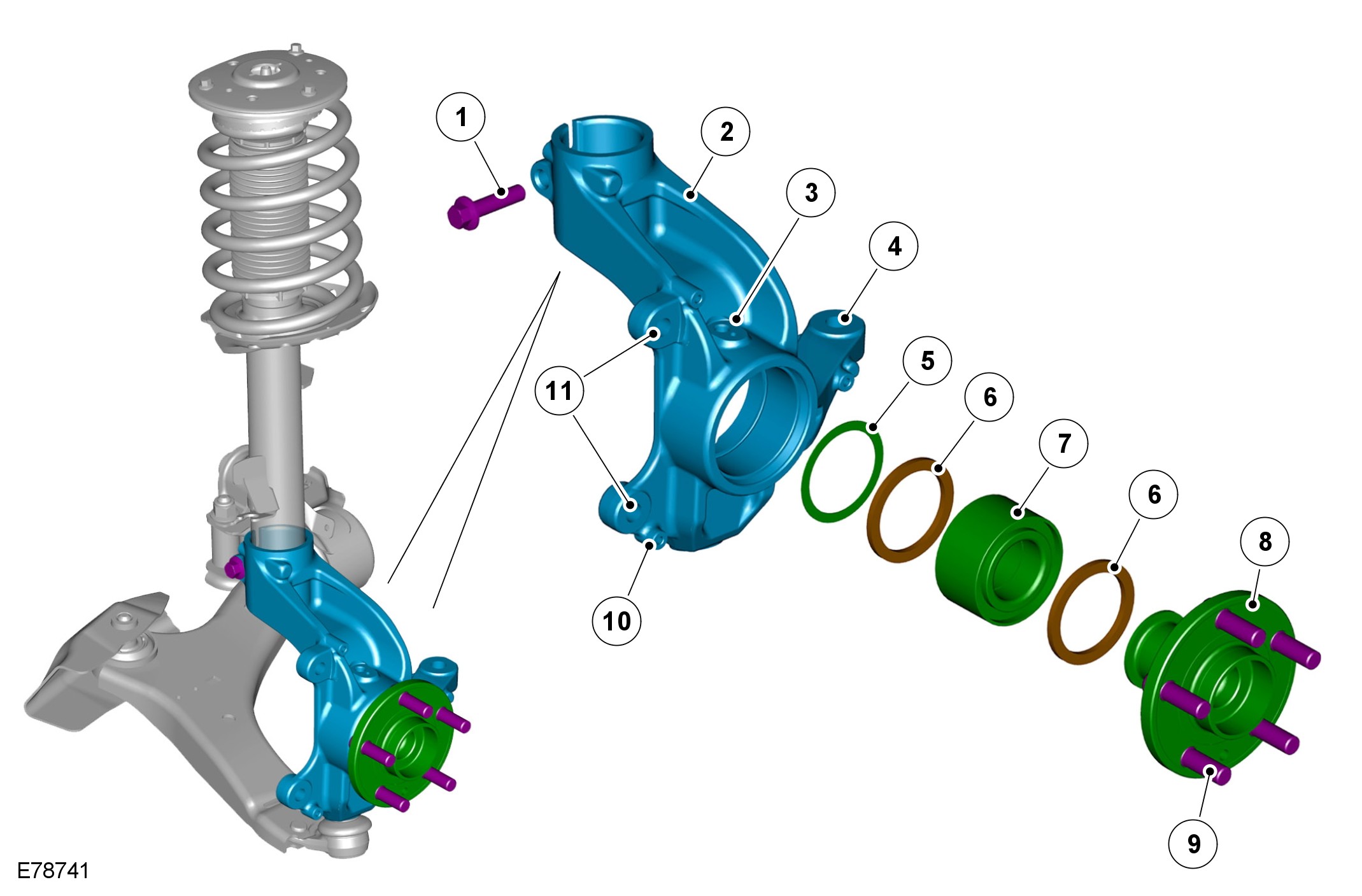 The cast steel wheel knuckle provides the attachment for the lower control arm, spring and damper assembly, wheel hub and bearing assembly and the steering tie-rod.