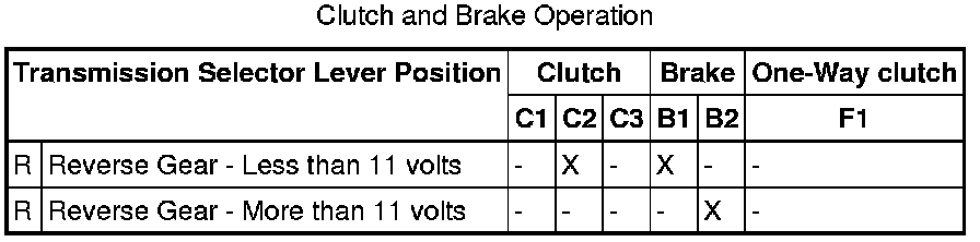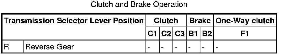 If the selector lever is moved from N to R and the vehicle is travelling forwards, reverse selection is prevented if the vehicle speed is 11 km/h (6.8 mph) or more. When reverse lock-out is activated, the clutch (C3) is released without energizing solenoid (SLC3), preventing the transmission from selecting reverse gear.