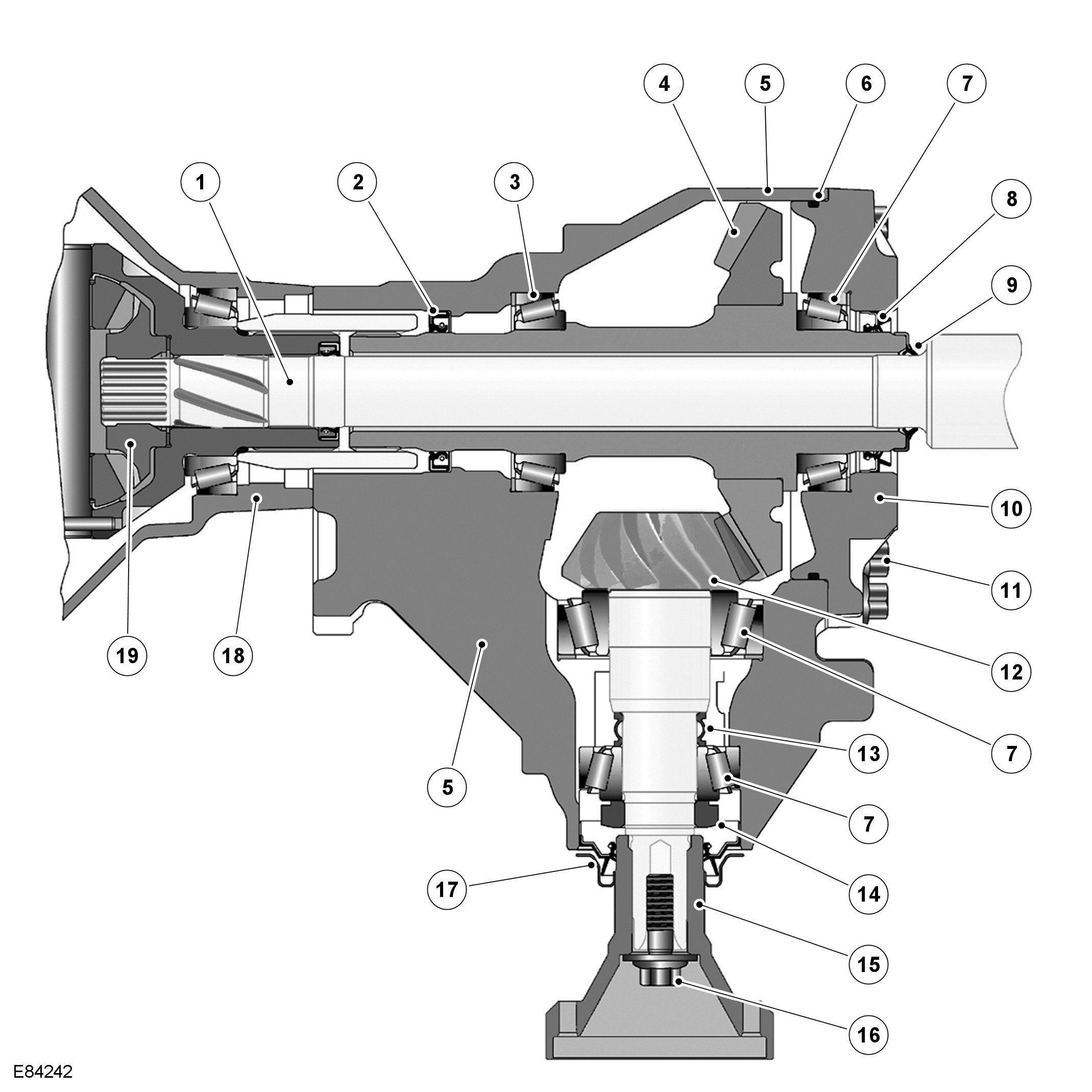 Drive from the transmission differential drives the crown wheel drive gear, which in turn rotates the pinion gear. Drive is passed from the pinion gear to the drive shaft and the rear differential via the drive flange attached to the pinion gear shaft.