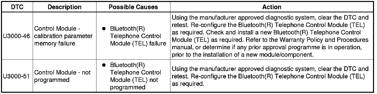 The table below lists all Diagnostic Trouble Codes (DTCs) that could be logged in the Bluetooth(R) Telephone Control Module (TEL), for additional Diagnosis and Testing information refer to the relevant Diagnosis and Testing Section.For additional information, refer to Cellular Phone Initial Inspection and Diagnostic Overview